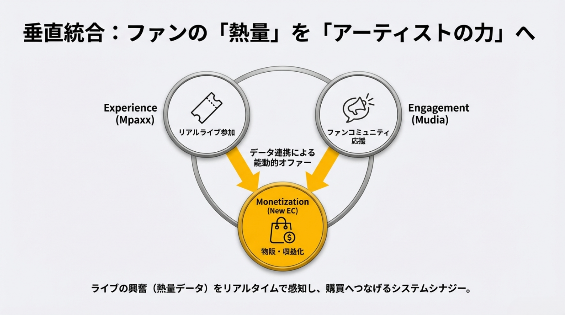 動員が増え始めたフェーズに対し、Mpaxxの来場データやMudiaの応援データを活用した最適な販売促進をシステム側でサポート。個人の発信力だけに頼らない、プラットフォーム全体のシナジーによる売上創出を図ります。