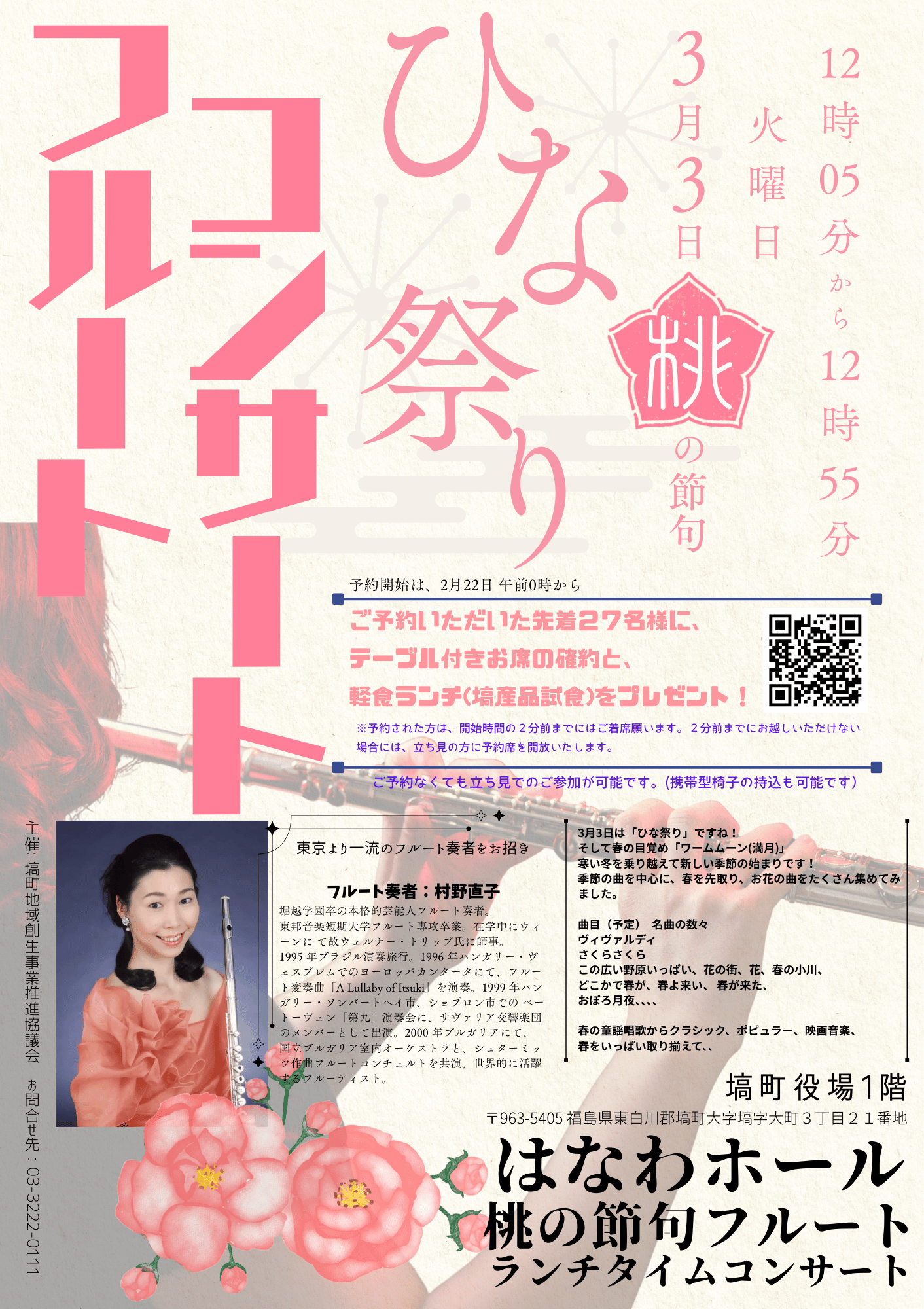 第二弾も前回に引き続き塙町産品の試食をお楽しみいただくとともに、世界的で活躍されているフルーティストをお招きして、春の訪れを皆さんで楽しんでいただける音楽をご用意。