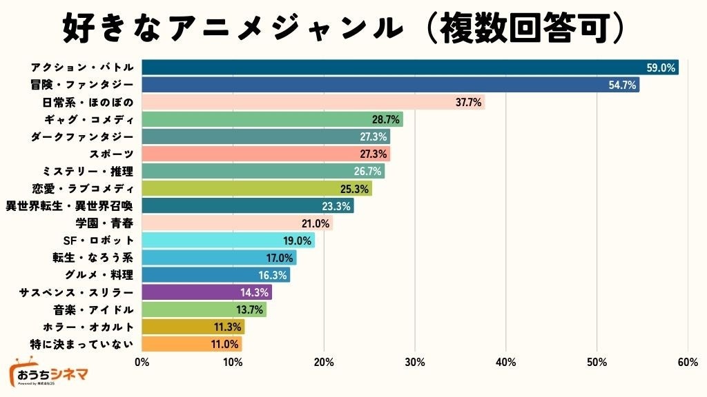ジャンル別では「アクション・バトル」や「冒険・ファンタジー」といった王道ジャンルが引き続き強い人気を誇る一方、「日常系・ほのぼの」のような癒し系作品も約4割の支持を得ており、視聴者の嗜好が多様化していることがうかがえます。