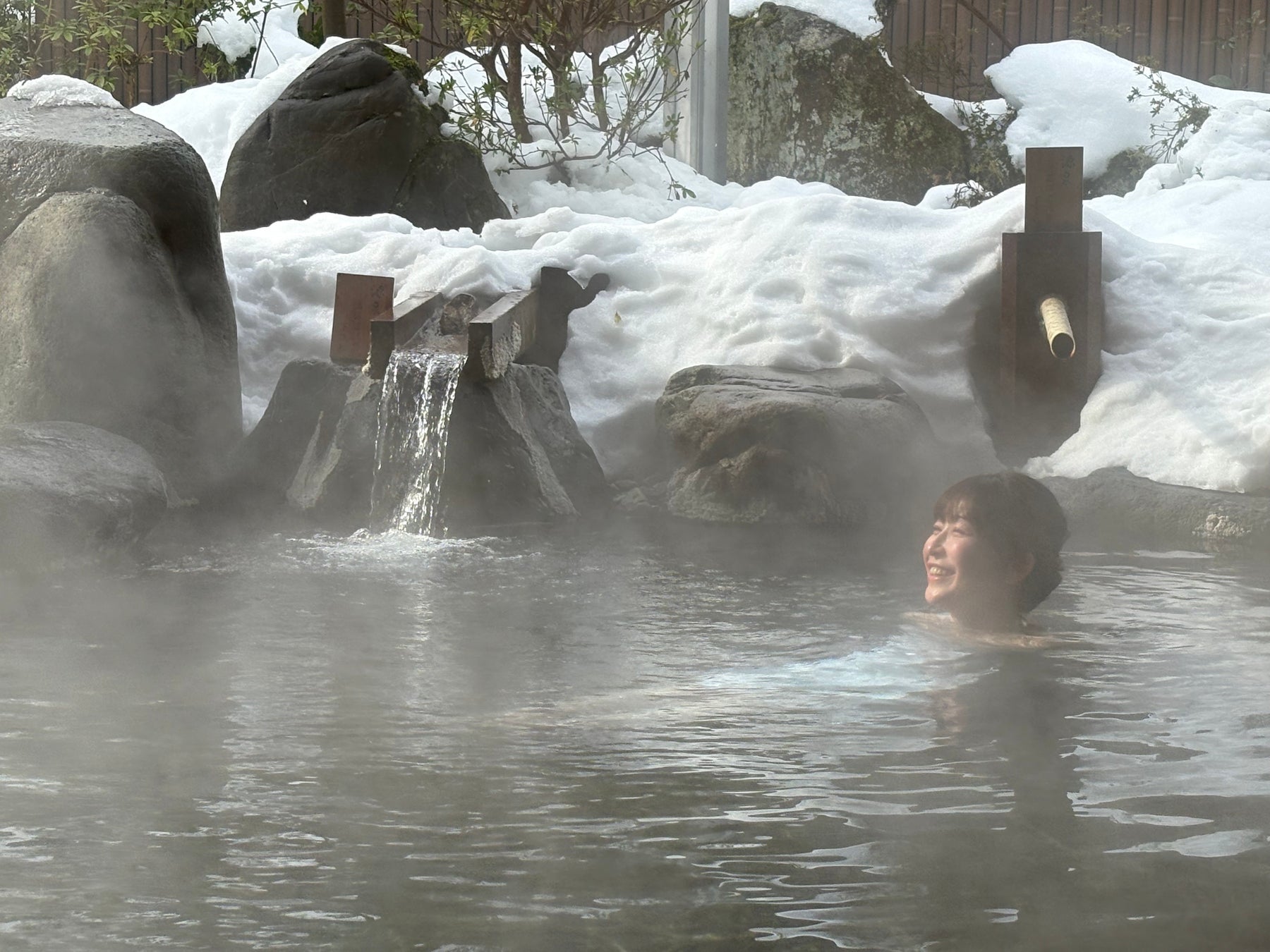 山代温泉を代表する温泉宿では、宿全体2万坪の約半分を占める日本庭園をはじめ、滝と川を望む足湯や大浴場などがあります。源泉かけ流しの露天風呂では、雪景色を眺めながら美肌の湯に癒される小野さん。