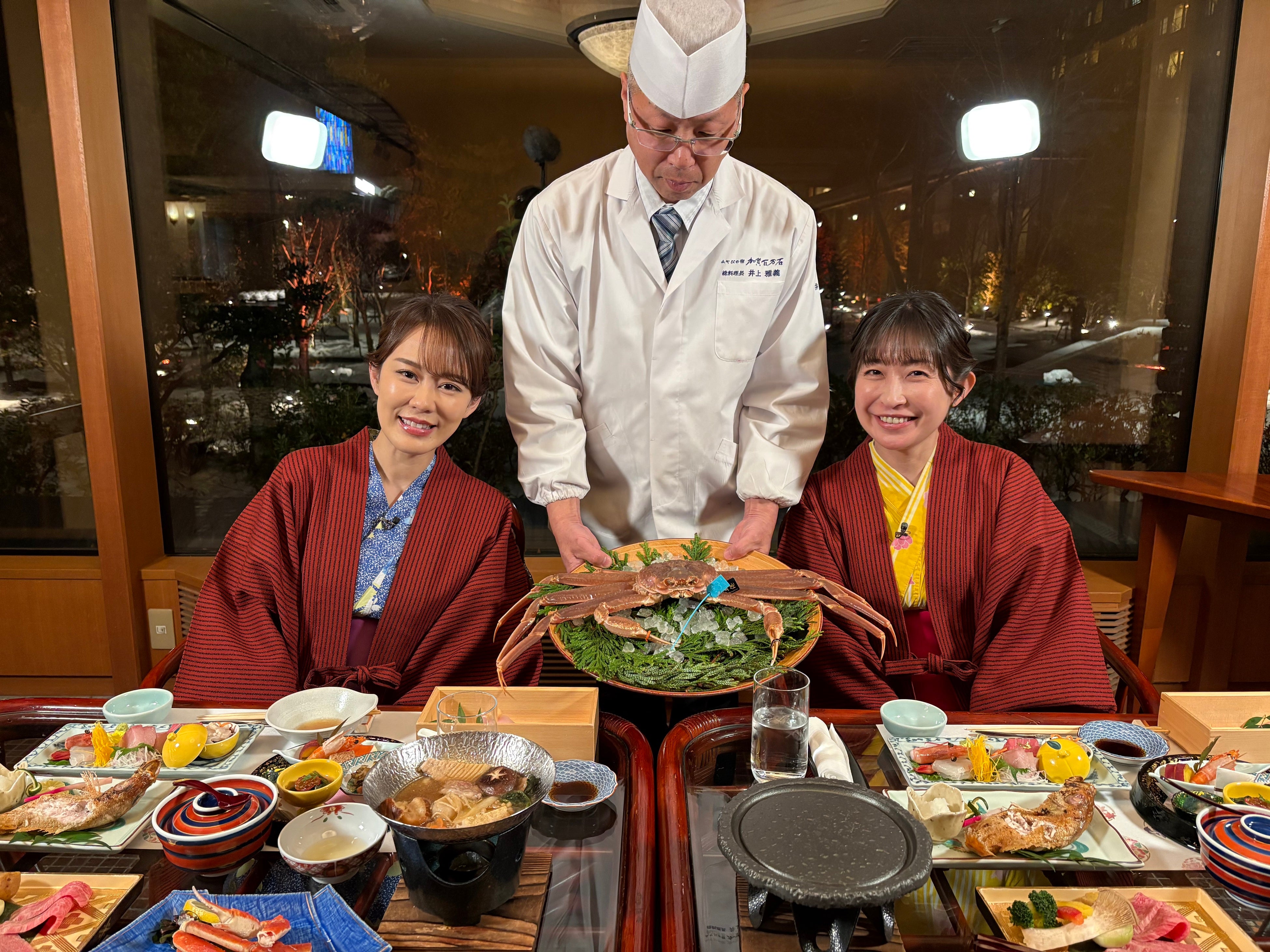会席料理の寒ブリや甘えび。さらにはタグ付きの「加能ガニ」を楽しむ2人。丘さんからは「幸せしかない!」という声も飛び出します。