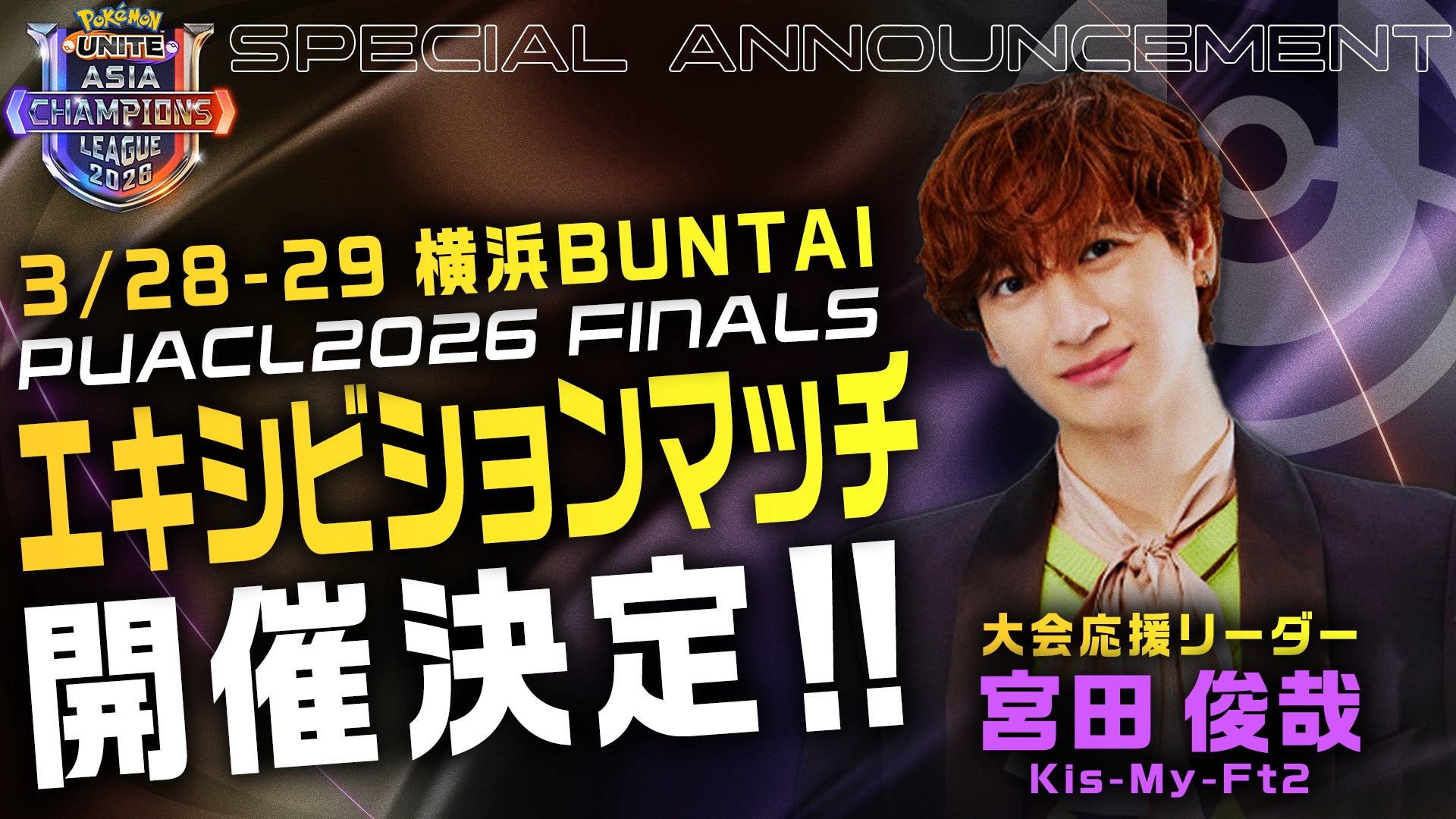 2026年はポケモン30周年という特別な年となっております。そのスペシャルな年に開催される『Pokémon UNITE(ポケモンユナイト)』のアジア頂上決戦「Pokémon UNITE Asia Champions League 2026 FINALS」(以下、PUACL2026)について、今年はアジア各地域のトッププロチームに加え、アジア以外の地域からも強豪を招待し過去最大級のスケールで開催。海外出場チームの詳細や会場コンテンツ、チケット販売情報、そして大会応援リーダーを務めるKis-My-Ft2 宮田俊哉さんの最新情報を発表いたします。