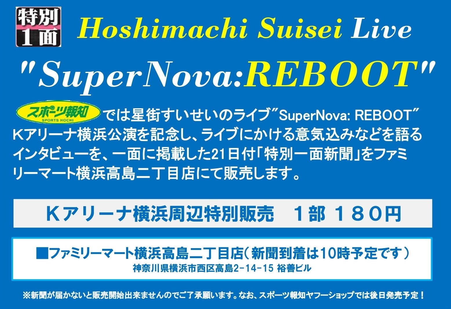 スポーツ報知を発行する報知新聞社(代表取締役社長・長谷川剛)は2月21日にKアリーナ横浜で開催される公演を記念して、エリア特別1面新聞をファミリーマート横浜高島二丁目店で発売します。ライブへの意気込みを語るインタビューを掲載。ライブ参戦の記念にぜひお買い求めください。(特別1面以外のページは21日付スポーツ報知東京版と同様になります)