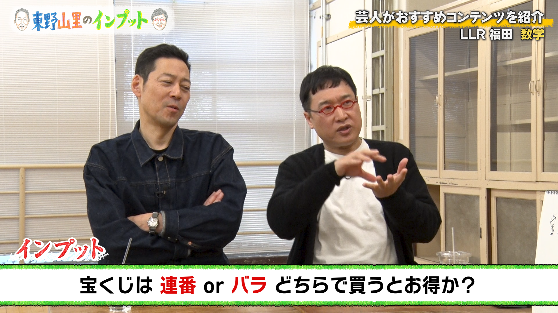 「誕生日のパラドックス」では、クイズを出題。「23人いたときに同じ誕生日が2人いる確率は?」との問いに、東野と山里も真剣に向き合います。福田がヒントを授けるも、東野は「耳からケムリが出そうなのを何とかおさえようとしている……恥ずかしいから」と苦笑い。福田が出した答えとは?