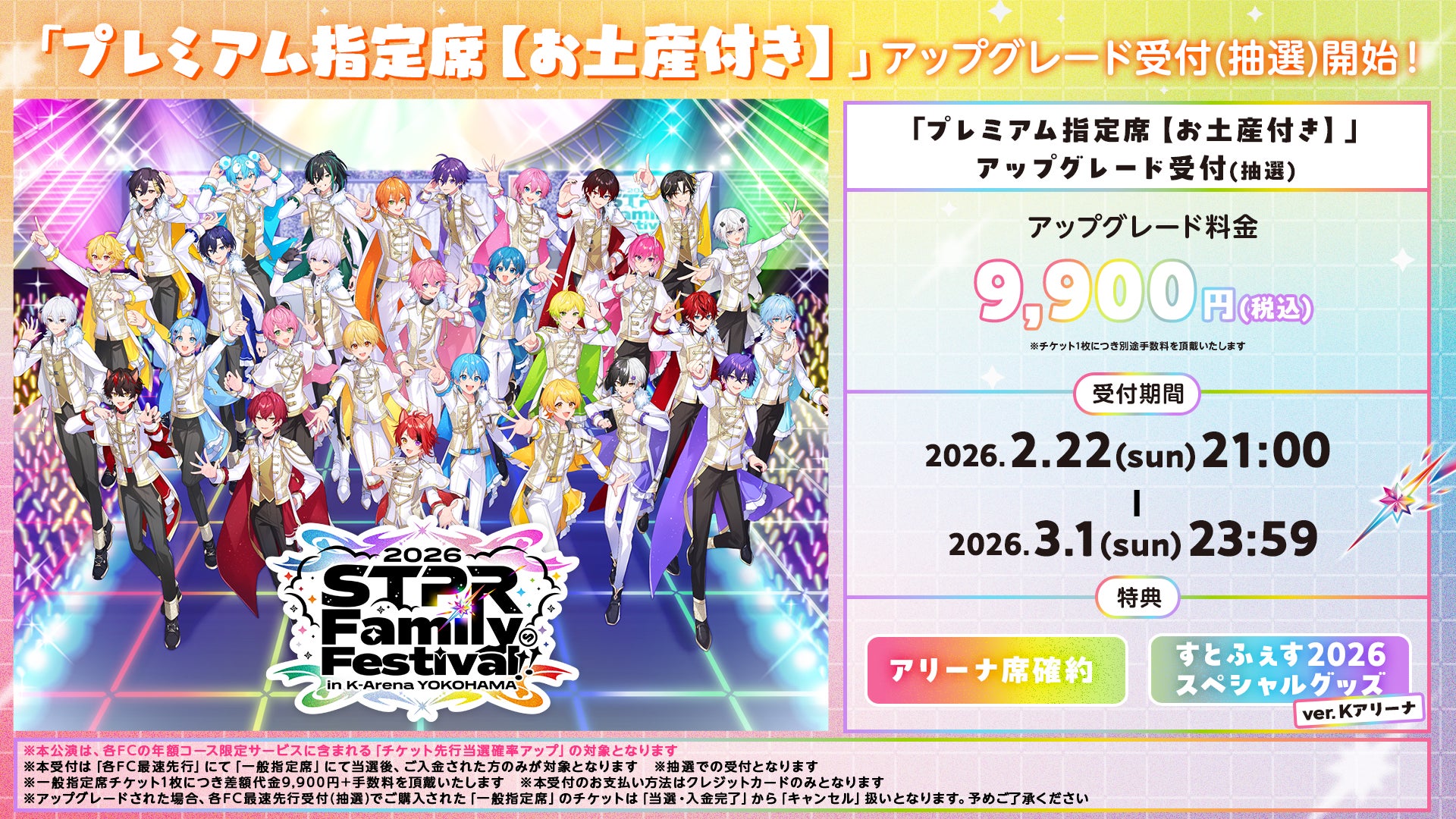 株式会社STPR(本社:東京都渋谷区、代表取締役:柏原真人、以下STPR)は、2026年3月28日(土)・29日(日)にKアリーナ横浜で開催される大型ライブイベント『STPR Family Festival!! 2026』において、2026年2月22日(日) 21:00より、チケットの「オフィシャル先行(抽選)」受付を開始したことをお知らせいたします。