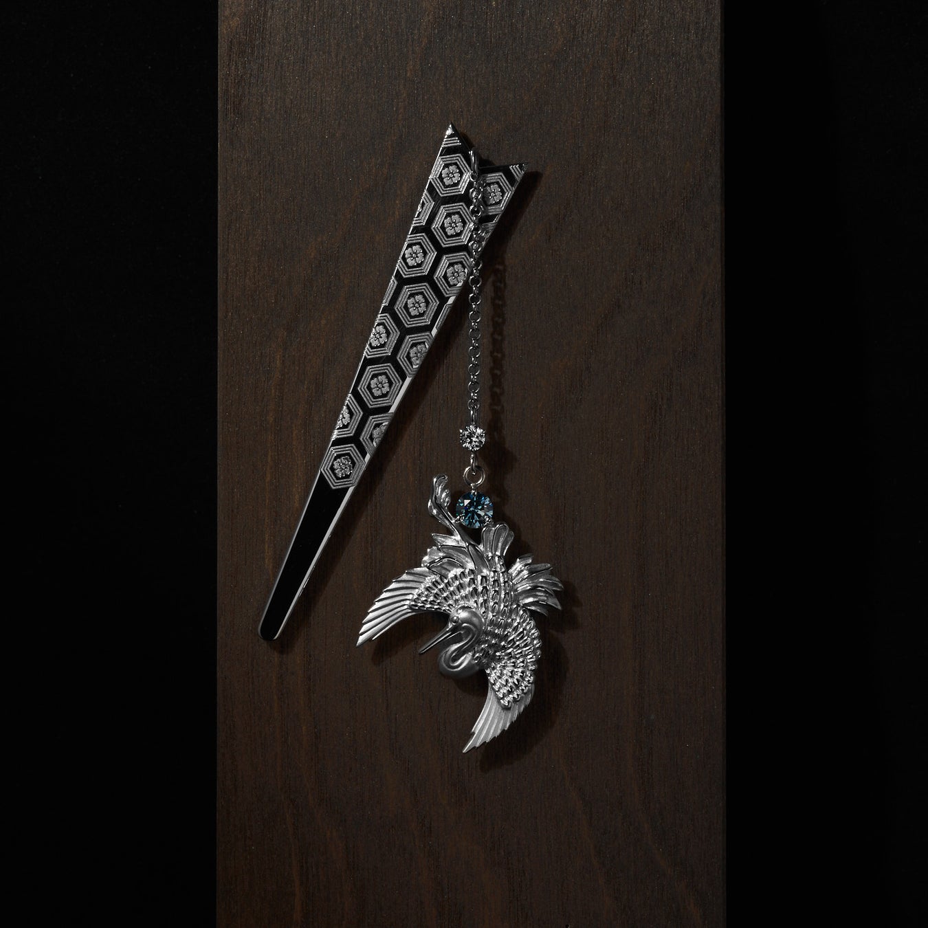 花色地「亀甲鶴文袷狩衣」に描かれた鶴を写し、ホワイトゴールドで精緻に造形した根付けべら。優雅な翼と曲線に、吉祥と気品を宿す逸品です