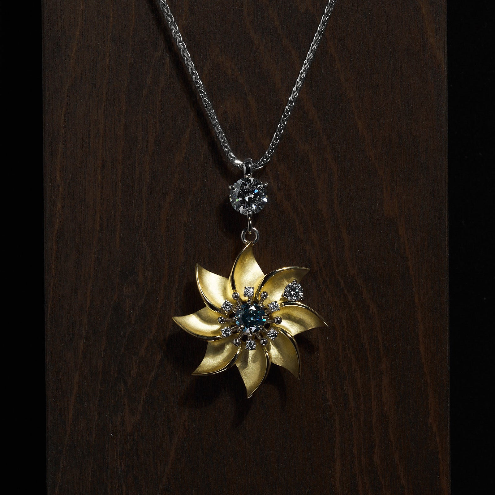 凛とした空気の中で咲く花を金とブルーダイヤで表現。中心のブルーダイヤと重なり合う金の花弁が光を受けて繊細にきらめき、装いに気品と華やぎを添える一品です。