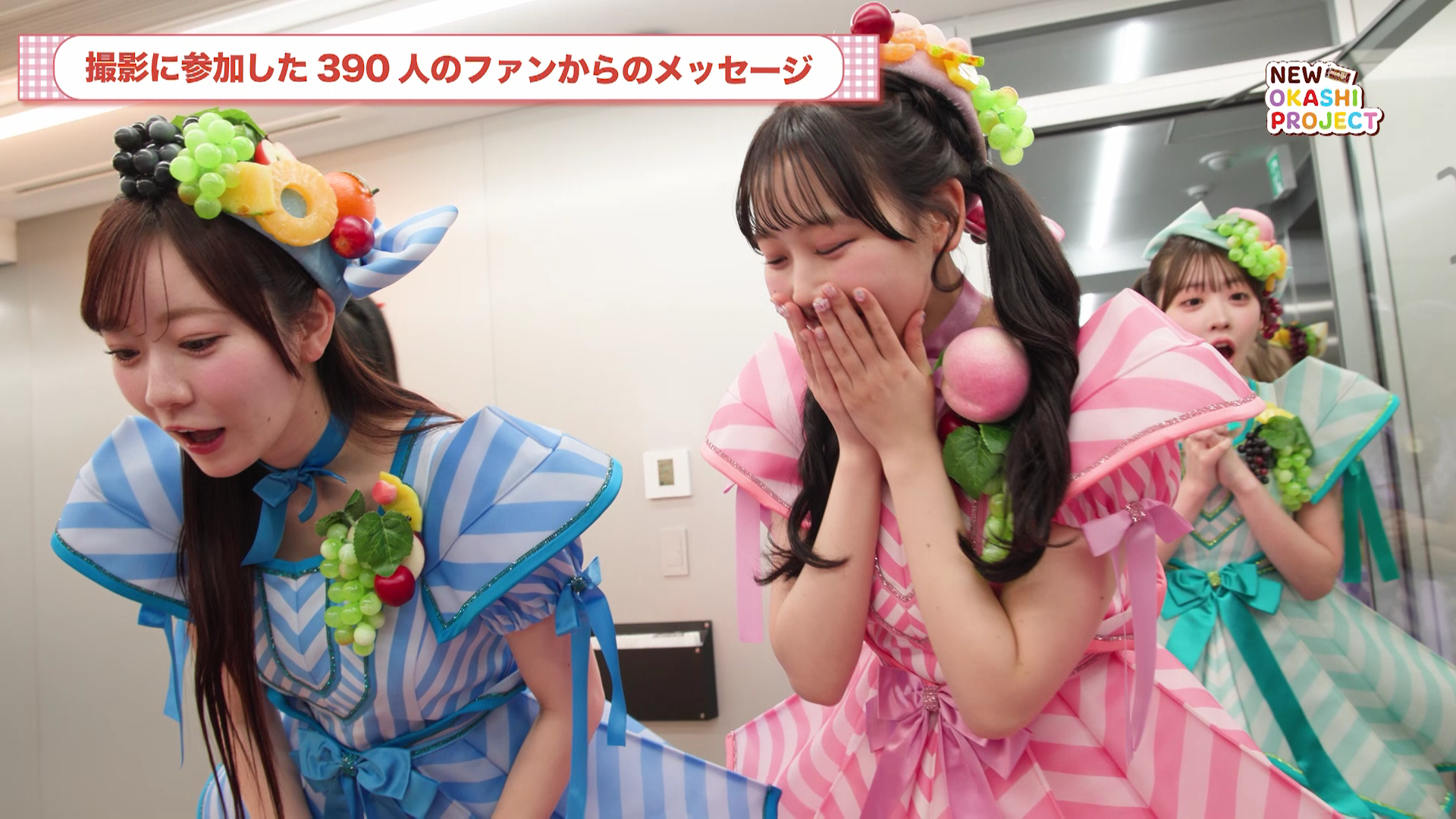 ファン390名が書いたメッセージボードをサプライズで用意!「すごーい!」「嬉しい!」「可愛い!」とメンバー大興奮!撮影後「ファンの方と大人数での撮影」「上から見たら文字になっている人文字演出」など初めてづくしの撮影を振り返る。