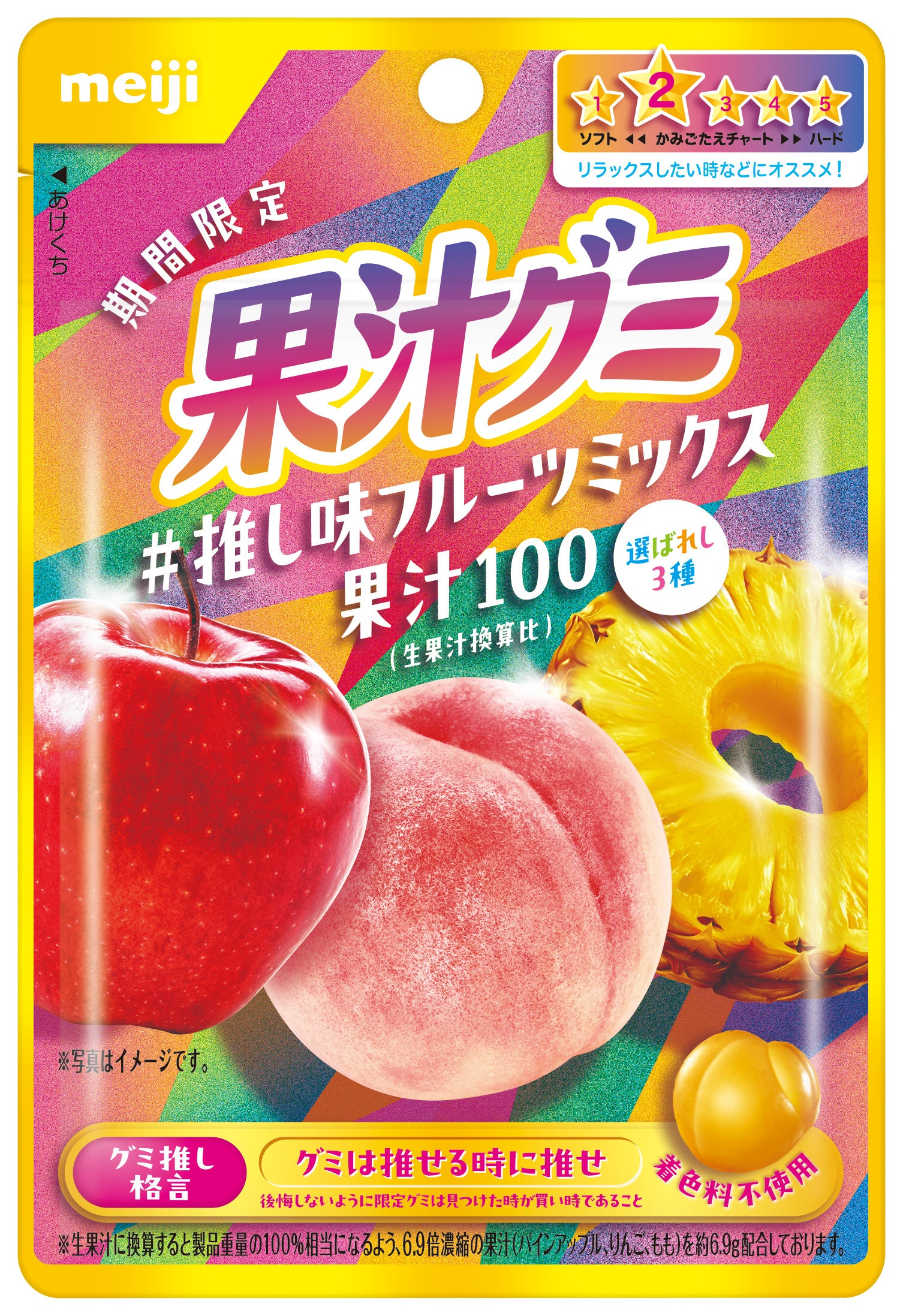 2025年春に実施した「ミックスしたい果汁グミの味3種」を募集するSNS企画では21,636票が集まり、その結果、上位3種に選ばれた「もも」「パインアップル」「りんご」を使用。1つのパッケージで、3つのフルーツの濃厚でジューシーなおいしさをお楽しみいただけます。また、心地よい歯切れのよさが特長の食感(かみごたえチャート2)で、リラックスしたいときにぴったりです。パッケージデザインは全3種類で、それぞれに「グミ推し格言」が書かれています。ぜひ手に取ってご覧ください。
