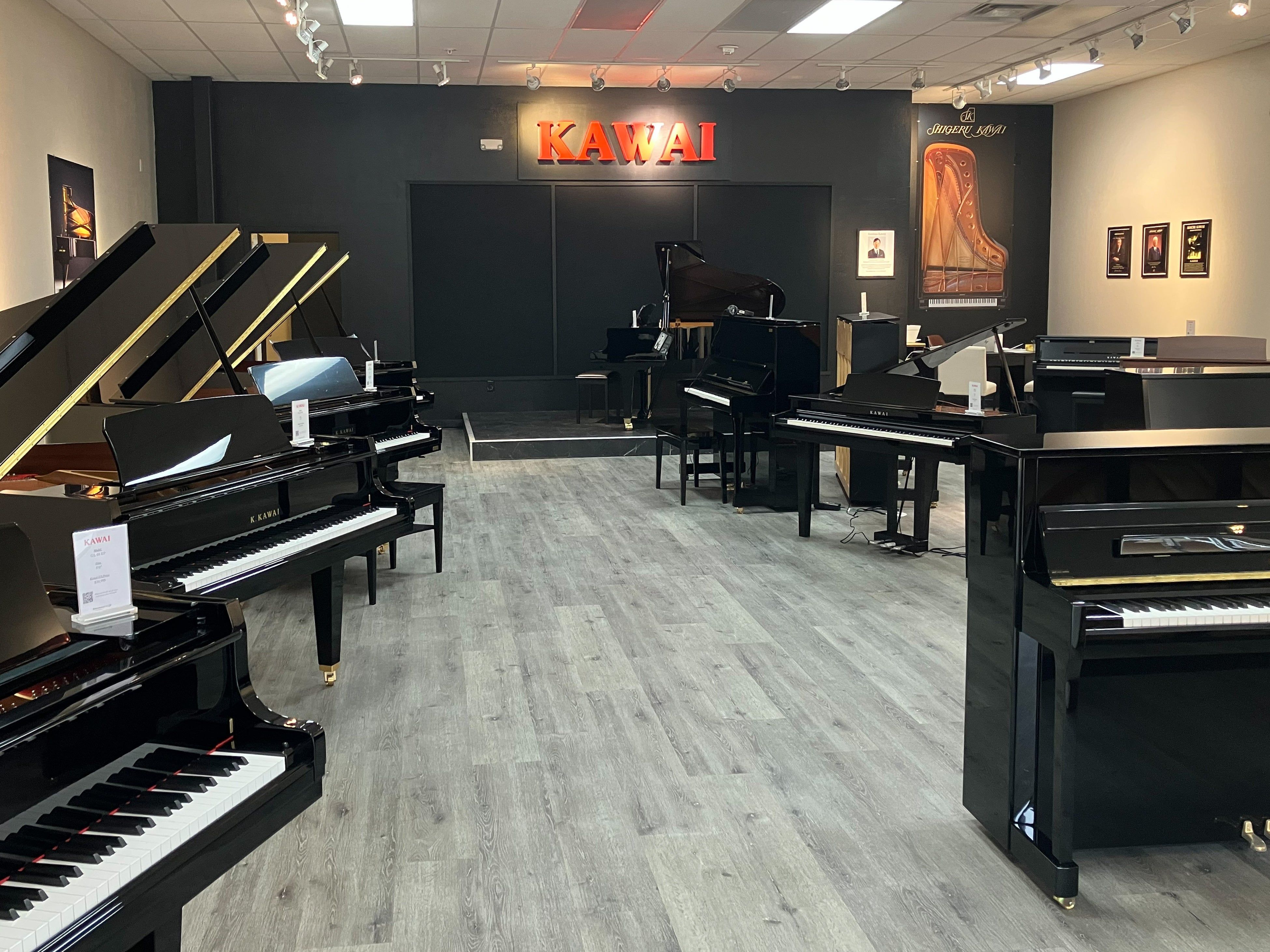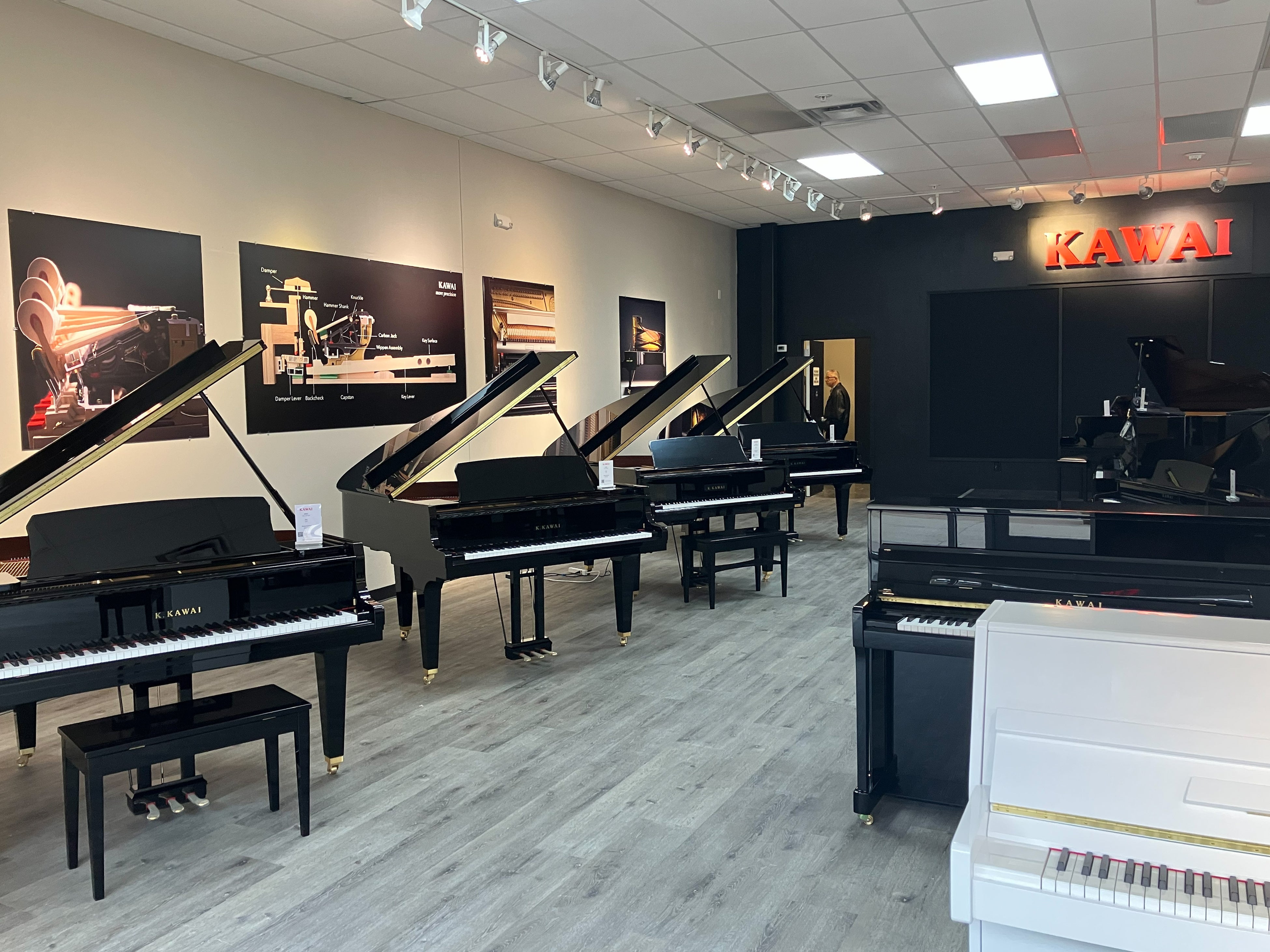 今回の店舗は、カワイ アメリカとして初めてショッピングモール内に出店する店舗となります。特に週末には多くの来訪者が集まるロケーションで、より幅広いお客様にKAWAIのピアノに触れていただける環境が整いました。店内には、グランドピアノ、アップライトピアノ、電子ピアノまで幅広いラインアップを展示しており、Shigeru Kawaiグランドピアノを含む多彩なモデルをその場で試弾いただけます。