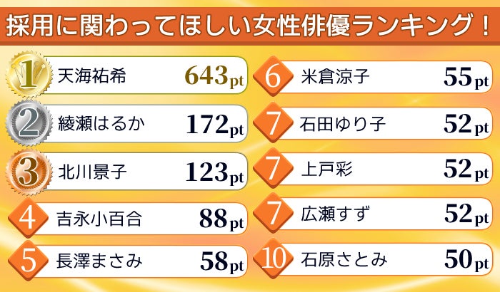 明るく潔い性格に注目が集まり、面接で必要とされるコミュニケーション能力や質問力が期待できると、第5位に長澤まさみが選ばれました。快活さや清々しさのある対応で、企業の代表として応募者に好印象を与えそうです。