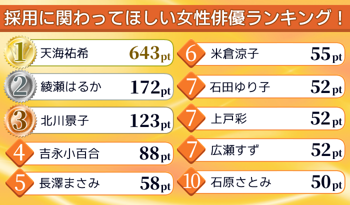 明るく潔い性格に注目が集まり、面接で必要とされるコミュニケーション能力や質問力が期待できると、第5位に長澤まさみが選ばれました。快活さや清々しさのある対応で、企業の代表として応募者に好印象を与えそうです。