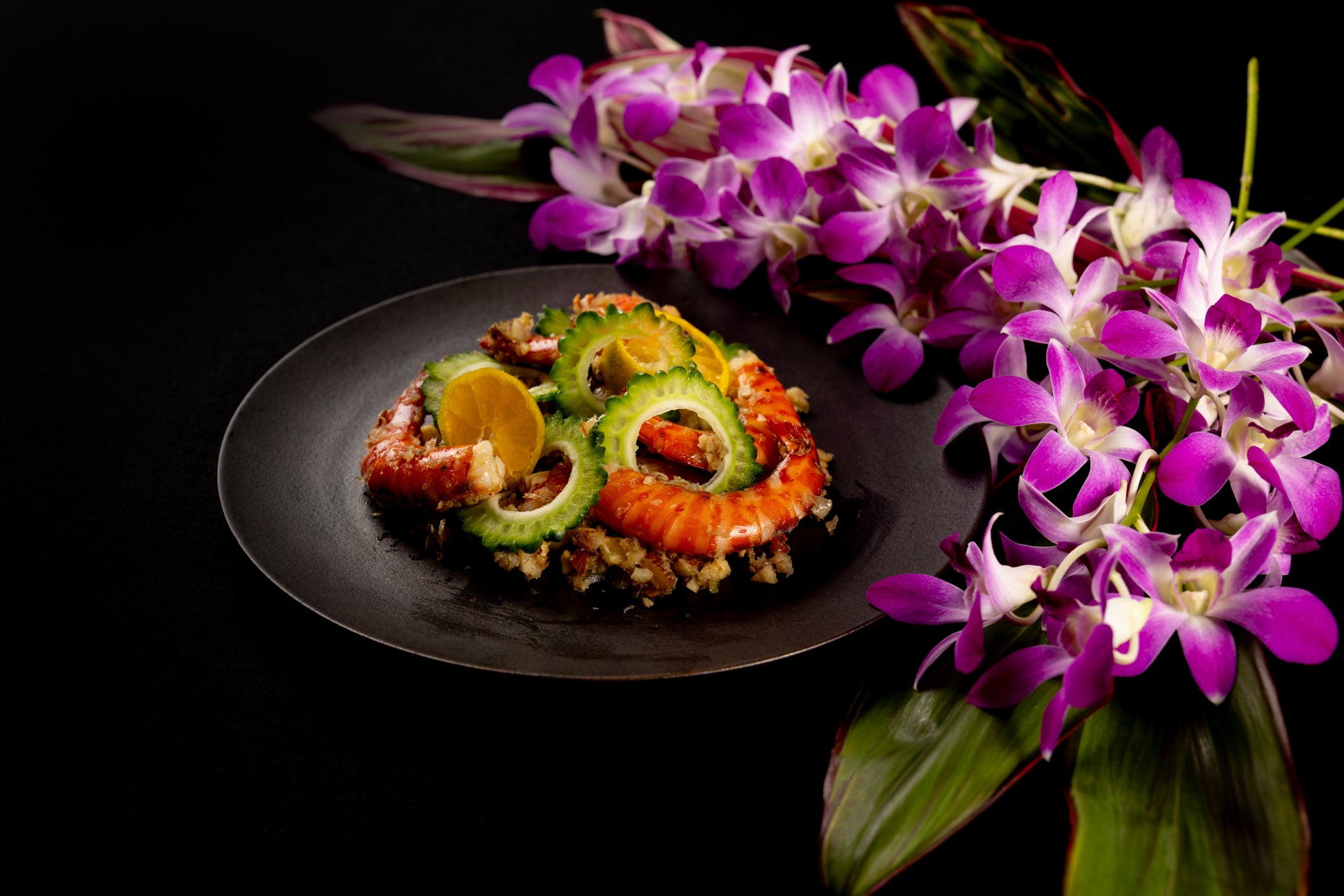 沖縄の食材や調味料をふんだんに使った南国アレンジで料理を仕上げていく