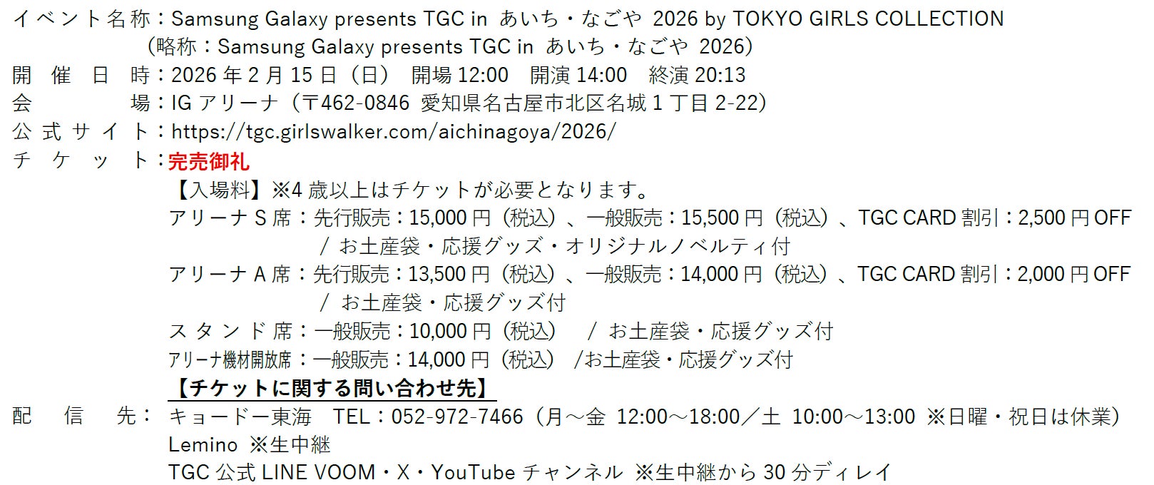 東京ガールズコレクション実行委員会(企画/制作:株式会社W TOKYO)は、2026年2月15日(日)にIGアリーナにて、『Samsung Galaxy presents TGC inあいち・なごや 2026 by TOKYO GIRLS COLLECTION』(TGC in あいち・なごや)を開催しました。