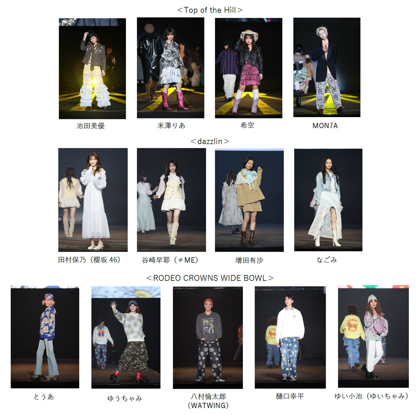 ヨーロッパ・アメリカでバイヤーがセレクトした古着、オリジナル・インポートクローズを、圧巻の商品量で取り揃えたヴィンテージショップで、その時代のカルチャーを築き上げた上質なアイテムにより新しいスタイルを提案するTop of the Hill(トップオブザヒル)によるファッションショーでは、ライブハウスの世界観を表現した演出の中、国民的タレント池田美優がブローチを散りばめたストライプジャケットに、レースパンツでクラシカルさと軽やかさを掛け合わせたコーデを着こなし、Z世代のファンだけではなく、人気インフルエンサーからも絶大な支持を受けている米澤りあは、フリンジスカートにブーツを取り⼊れ、存在感のあるウエスタンスタイルを表現。そして、SNSで絶大な人気を誇る希空は、エッジの効いたライダースジャケットに鮮やかなピンクのフリンジドレスを合わせ、さらにファー付きのカウボーイハットとウエスタンブーツで遊び心をプラス。ロックとヴィンテージが融合したパワフルな装いで、ランウェイに華を添えました。新世代のニューアイコンMON7Aは、クラシカルなテーラードジャケットに鮮やかなインナーと柄パンツを効かせたミックススタイルで、ブランドの多彩な世界観を表現しました。