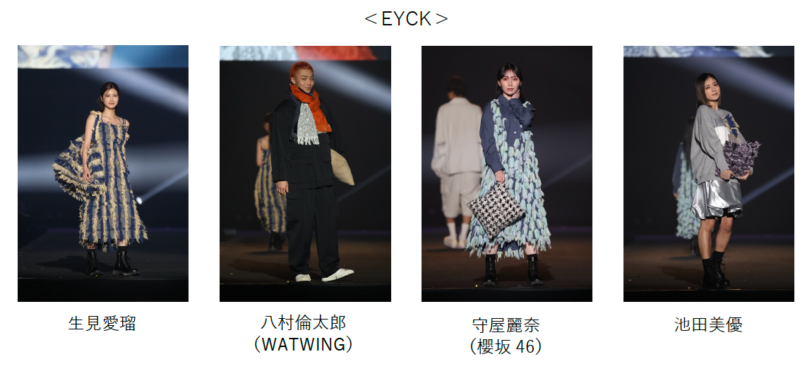 日本最大の毛織物産地「尾州」から提案するファクトリーブランドで、ブランド名にはEmotion (感情)、Yarn (糸)、Craft (技術)、Knot (結び目) の意味を持ち、糸と技術を結び感情にふれるモノづくりを提案しているTGC初登場のEYCK(エイク)のファッションショーでは、尾州の伝統技術をふんだんに取り入れ、愛知県出身でモデル・俳優の生見愛瑠が、尾州で織り上げたウール素材を使用し、糸の表情を生かしたフリンジデザインが印象的なワンピースで登場。続いて、WATWINGの八村倫太郎は、異なる素材を組み合わせたオレンジのマフラーを主役にしたスタイリングを披露し、櫻坂46の守屋麗奈は、尾州の繊細な織りによる立体感のある生地を用い、伝統技術の魅力を感じさせるコーディネートでランウェイに。そしてラストには池田美優が登場し、TGC in あいち・なごやのファッションショーを華やかに締めくくりました。