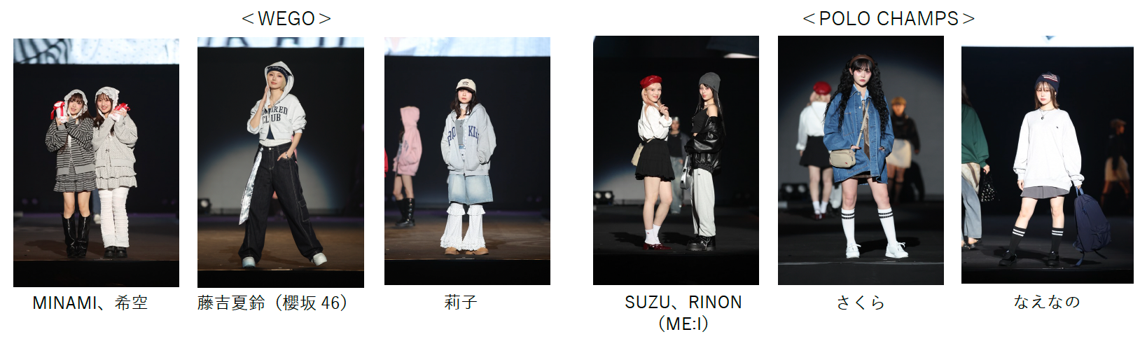 YOUR FANをコーポレートスローガンにかかげ、ファッションの提案にとどまらず、ストリートから派⽣している様々なカルチャーを伝え続け、全国に約180以上のストアを展開するWEGO(ウィゴー)によるファッションショーでは、“NEW SPRING”をテーマに、SNS総フォロワー数570万人越えのティーンを代表するインフルエンサーMINAMIとZ世代のトレンドを牽引する希空が、シルエットを揃えつつ、同素材のトップスとボトムスで統一感を出した“双子コーデ”でランウェイに登場。櫻坂46の藤吉夏鈴は、ストリートをベースに、スポーティーさとワークテイストを掛け合わせたトレンド感あふれるスタイリングで、2024年に映画『違う惑星の変な恋人』で映画初主演を務め、東京国際映画祭の「アジアの未来部門」に選出、その後も話題作への出演が続く莉子は、カジュアルなパーカーやデニムに、繊細なレーススカーフやフリルパンツを合わせた甘辛ミックスコーデでランウェイを彩りました。