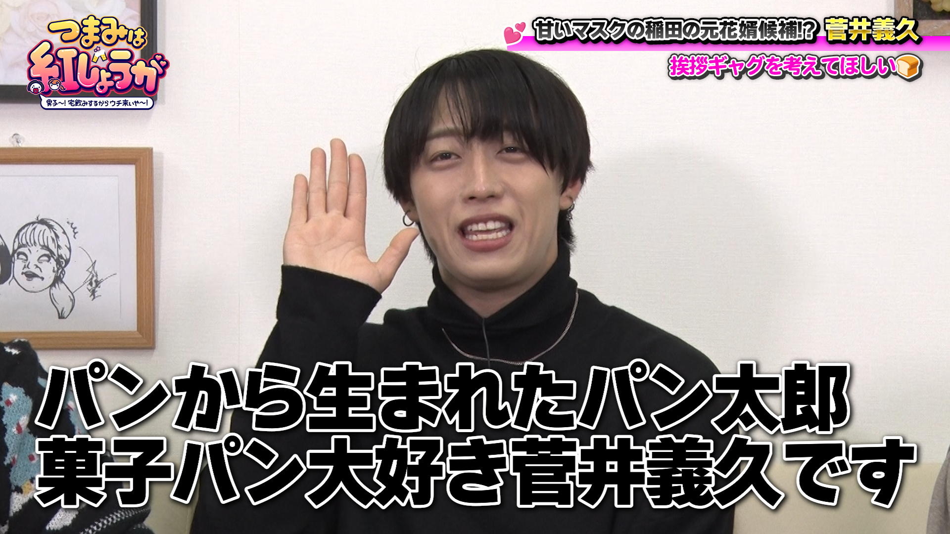 「自己紹介で使えるギャグを考えてほしい」と紅しょうがの2人にお願いする菅井。これまでにいくつかあったそうですが、新しい挨拶ギャグを考えてほしいということで、熊元プロレスが考えることに。稲田から「特技の尻もアピールできるのがいいと思う」と言われつつ、菅井が甘党男子の中で「菓子パン」担当だということから、熊プロはお尻を使った「菓子パンギャグ」を披露。それを見た菅井は「すごーーい! …けど1個いいですか?」と褒めつつもイマイチしっくり来ていない様子。スタッフから出たアイデアも参考にしつつ、稲田が代案を提案しますが、熊プロは納得いかない様子で……⁉ 3人であれやこれやと相談した結果、最終的にどういう形になったのでしょう?