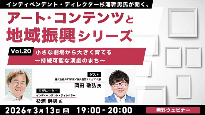 株式会社クリーク・アンド・リバー社(C&R社)は3月13 日(金)、アートやコンテンツを活用した地域振興に関心がある地域企業や自治体職員の方、コンテンツクリエイター、コンテンツ企業の方などを対象に、無料のオンラインセミナー「インディペンデント・ディレクター杉浦幹男氏が聞く、アート・コンテンツと地域振興シリーズvol.20 小さな劇場から大きく育てる ~持続可能な演劇のまち~」を開催します。
