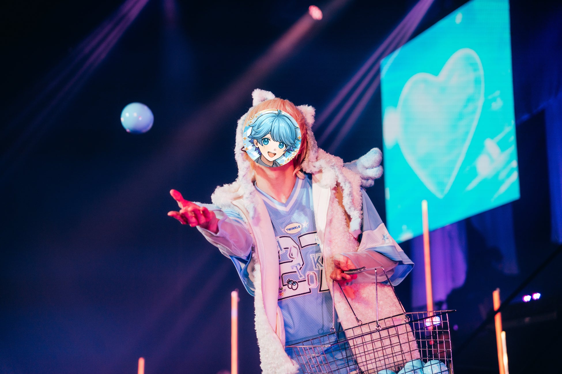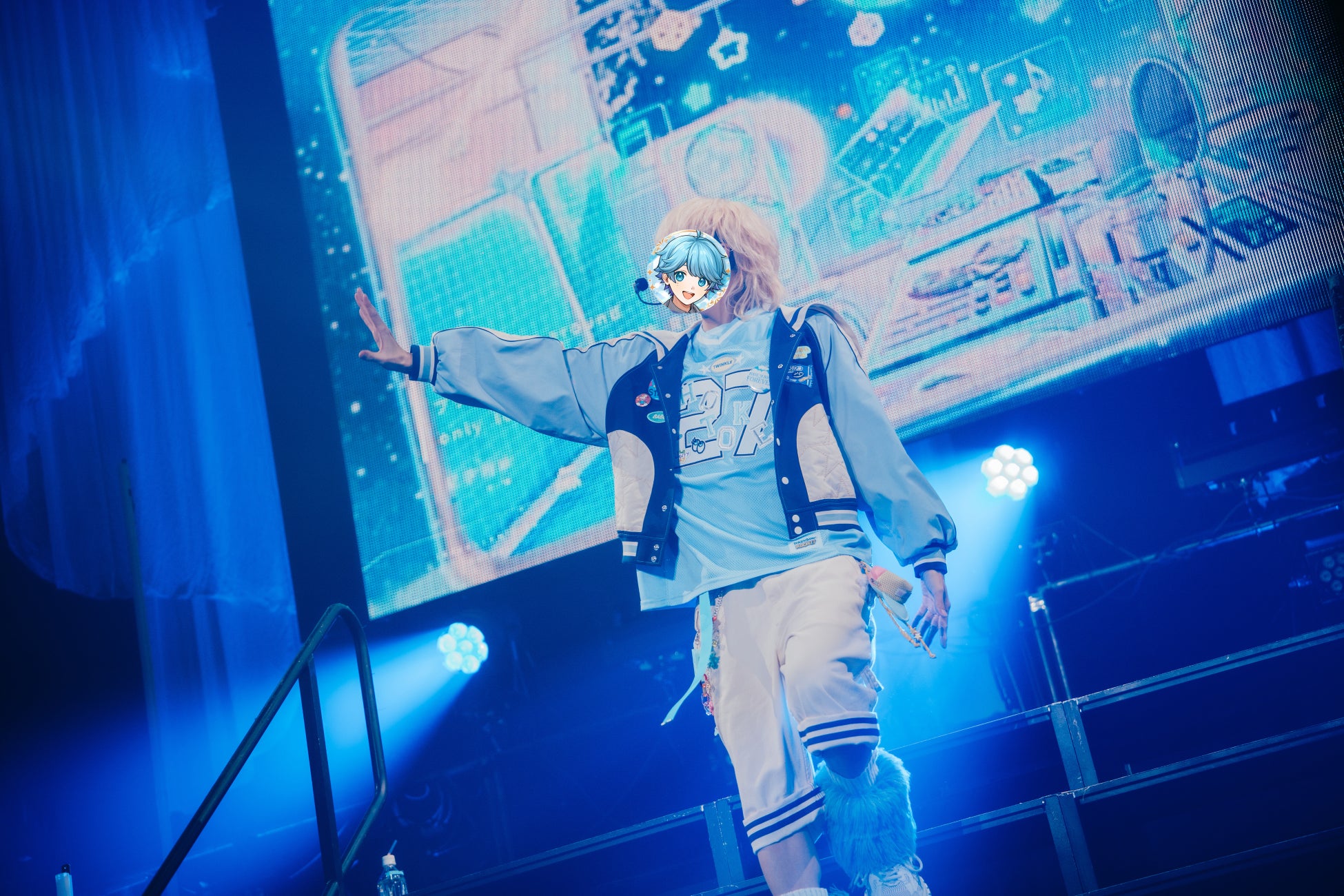 猫耳をつけてのにゃんにゃんタイムの後は、キュートな天使のターンへ。「いむいむ★エンジェルビーム」「天使になりたい」と連投して、スィートからアンニュイまで幅広い“可愛い”で虜にする。《じゃあね さよなら》の言葉を残すと、爽やかにステージから去っていった。ダンサーによるパフォーマンスタイムを経て、衣装チェンジした-hotoke-が登場。次なる目的地は、星の世界だ。「Twinkle Starlight」を導くと、ありあまる程の“好き”のパワーを再び届けていく。飛んで、跳ねて、ステップを踏んで。軽やかに彼が舞う様は、まるで天使が魔法の粉を振りまいているよう。このまま歌って踊るステージが繰り広げられていくのかと思いきや、なんと舞台上には白い紗幕が出現。-hotoke-もヘッドセットをハンドマイクに持ち替え、歌に注力するセクションへと潜っていった。甘く切ない歌声が響く「星流」、身振り手振りにも想いを乗せる「アストレア」と、丁寧にメッセージを紡ぎあげる-hotoke-。紗幕に投影された映像も緻密に計算されていて、たくさんの星のなかでスポットライトを一身に受ける彼は、宇宙に浮かんでいるようだった。「メモリークラウン」で紗幕がなくなると、今度はステージを端から端まで歩き回って、積極的に想いを伝えていく。真摯に訴えかける姿勢は、音楽を通して《僕らの物語に終わりはないから》と力強く示唆していた。