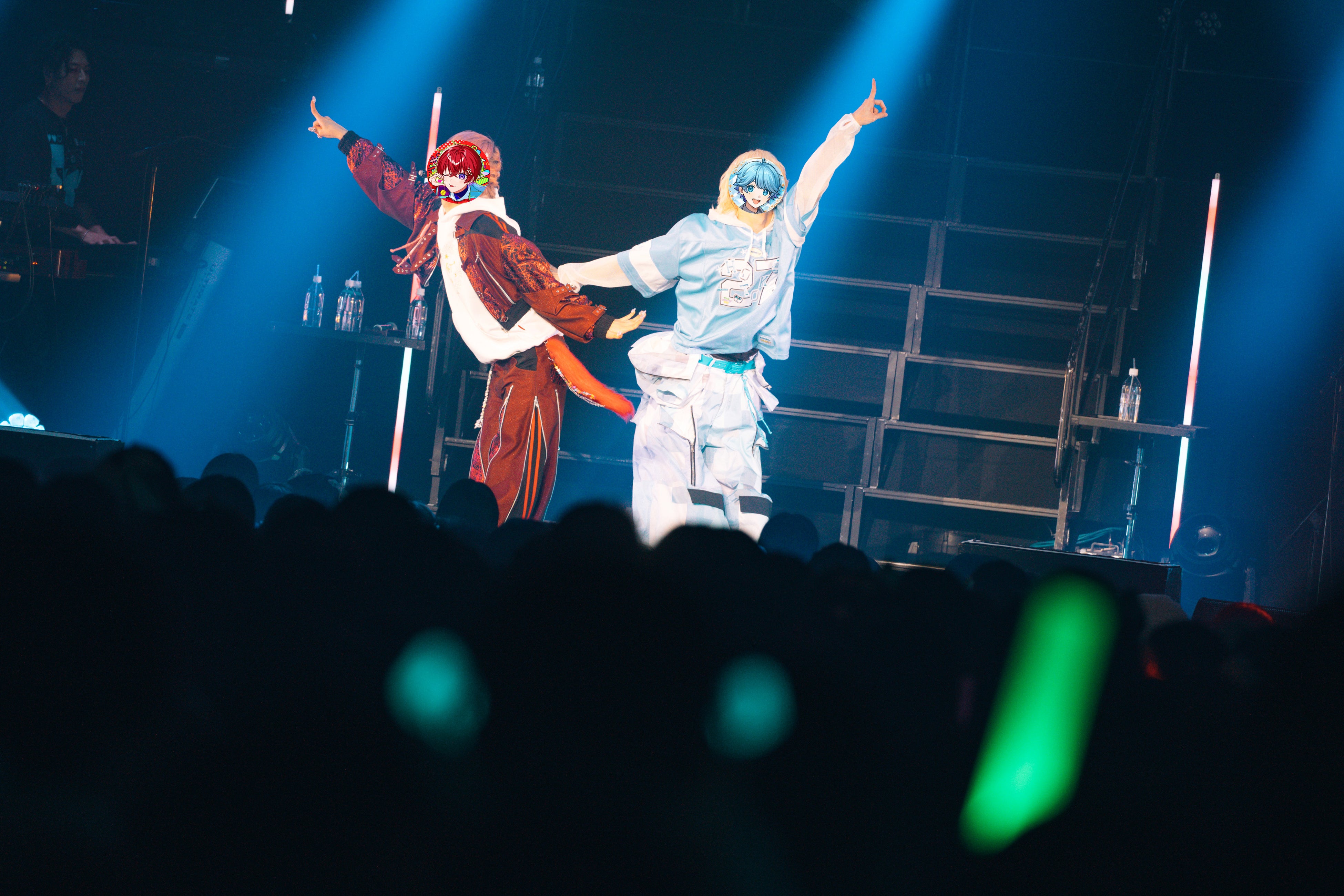 ここで突如として、ガチャを回すVTRが投下される。なんの前振りなのかと客席がざわめいたのも束の間、なんと「Coe. (すたぽら) 参戦」が告げられた。想像の斜め上を行く展開に、たちまち会場は大熱狂へ。「超次元LOVE理論→→→」をパフォーマンスするふたりの暴力的な可愛さたるや。可愛いが掛け合わさることで生まれる無限の可能性を、まざまざと物語る。さらには「チューリングラブ」もドロップし、息のあったステージで観客を釘付けにしたのだった。