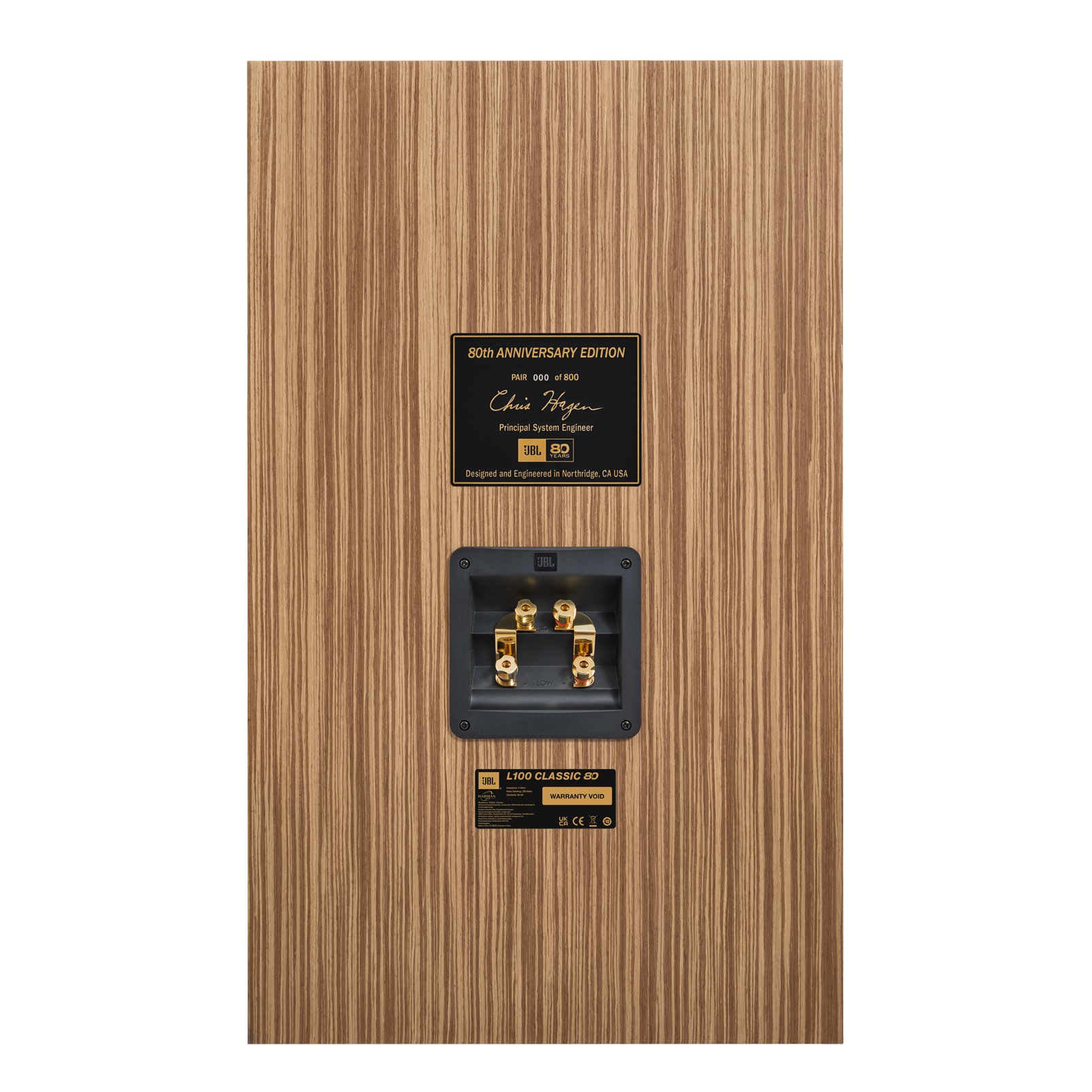 今回発売する「L100 Classic 80」の最大の特徴は、エンクロージャー全面に採用された美しいオーク材によるリアルウッド突板仕上げです。新たなウッドフィニッシュが施されたフロントバッフルには、ゴールドとブラックのJBLロゴをアクセントにしたブラウンのQuadrexフォームを、サテンブラック仕上げのウッドフレームで縁取ったグリルを装着。背面には、JBLチーフ・システムエンジニア Chris Hagen の署名と限定番号が刻印された記念プレートを備え、アニバーサリー・エディションであることを誇らしく示しています。