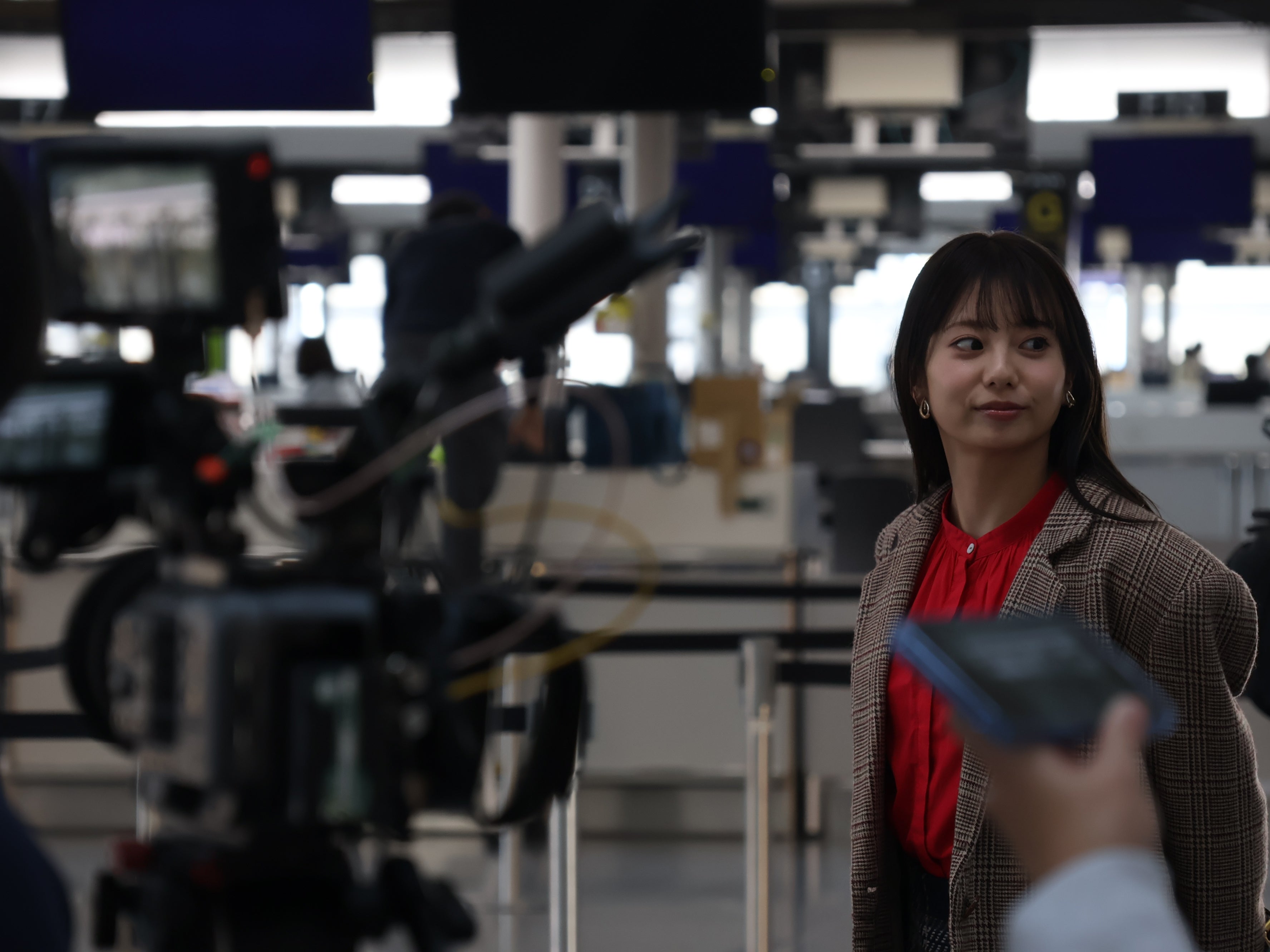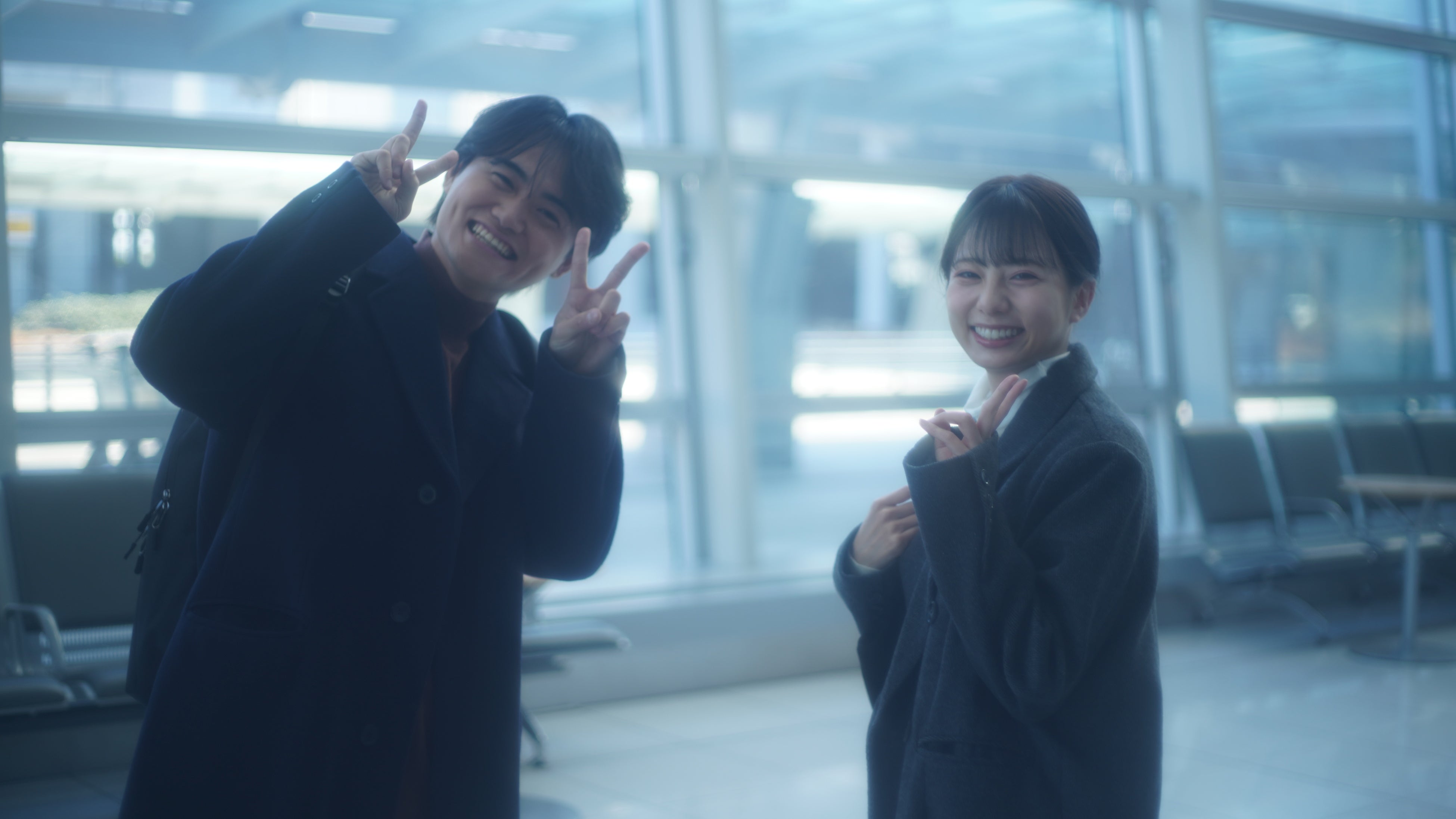スカイデッキは、滑走路まで300m、飛行機が滑走路まで移動する誘導路まではわずか約50mと、日本で一番近くに飛行機を感じられる展望デッキです。夕焼けを背景に、主演の林祐衣さんが空に飛び立つ飛行機を静かに見つめる―。その一瞬の表情に、空港という場所が持つ特別な情緒が重なり、役柄の心情をいっそう引き立てる印象的なカットとなりました。