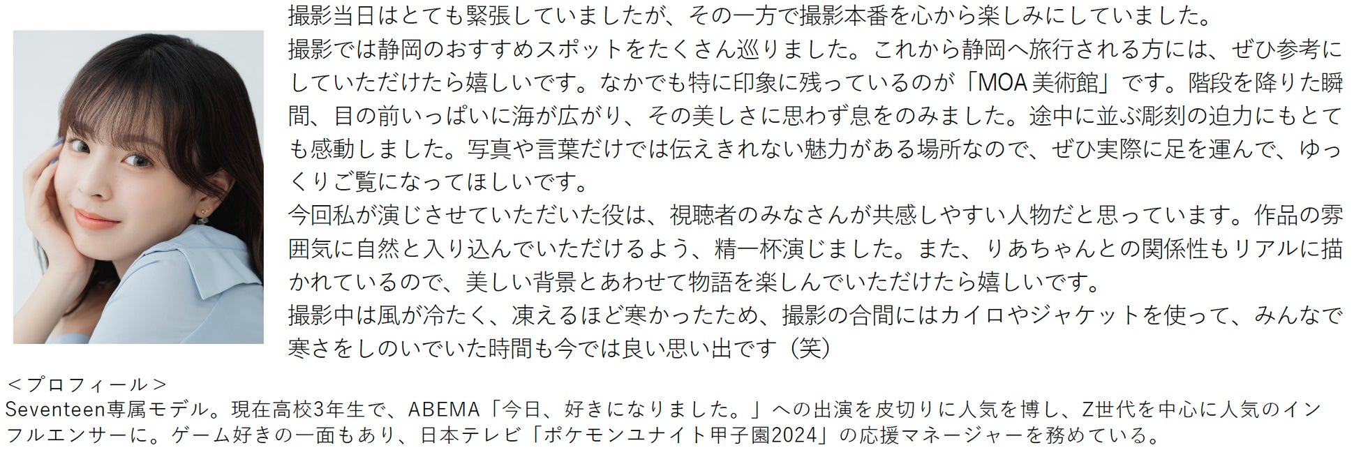 主演は、『Seventeen』専属モデルとして活躍する一方、ABEMAの大人気恋愛リアリティーショーで人気を集めた小國舞羽と、「女子高生ミスコン2023」でグランプリに輝いたカリスマモデルで、同じくABEMAの大人気恋愛リアリティーショーで注目された米澤りあの、Z世代から大人気の2人が務め、静岡の名所を舞台に恋に夢中になりすぎて親友との関係がギクシャク…?!そんな誰もが経験したことがあるような、親友とのすれ違いを描いた友情ストーリーです。