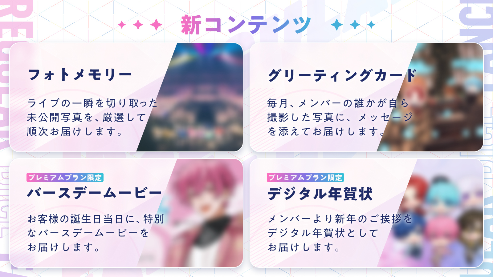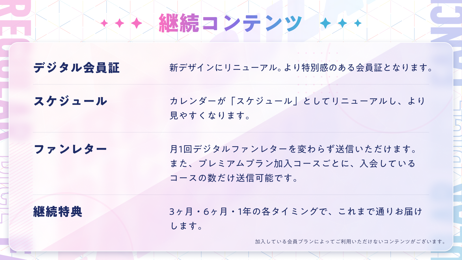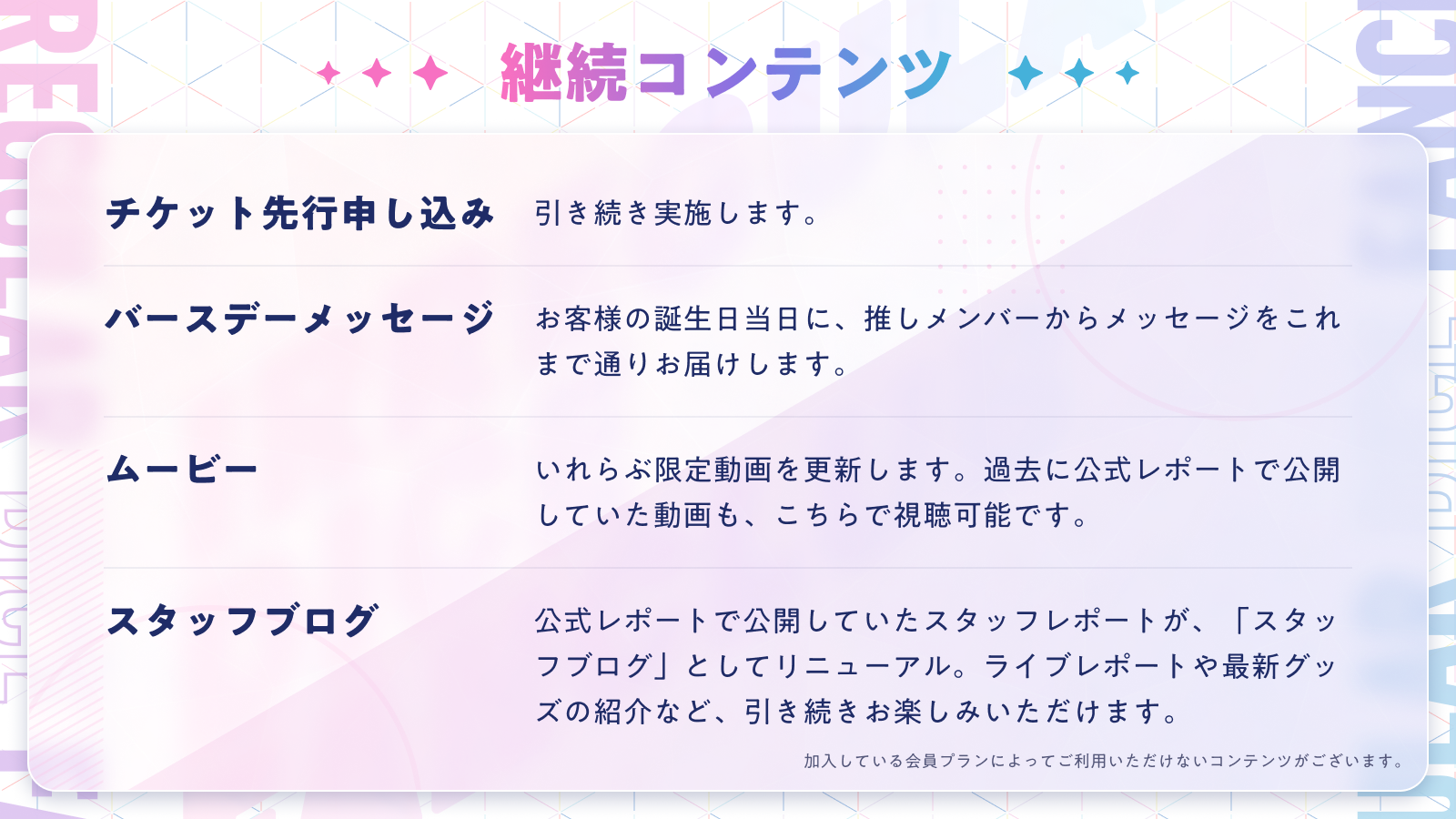 ファンクラブのリニューアルに伴いコンテンツの追加・廃止となるコンテンツがございます。