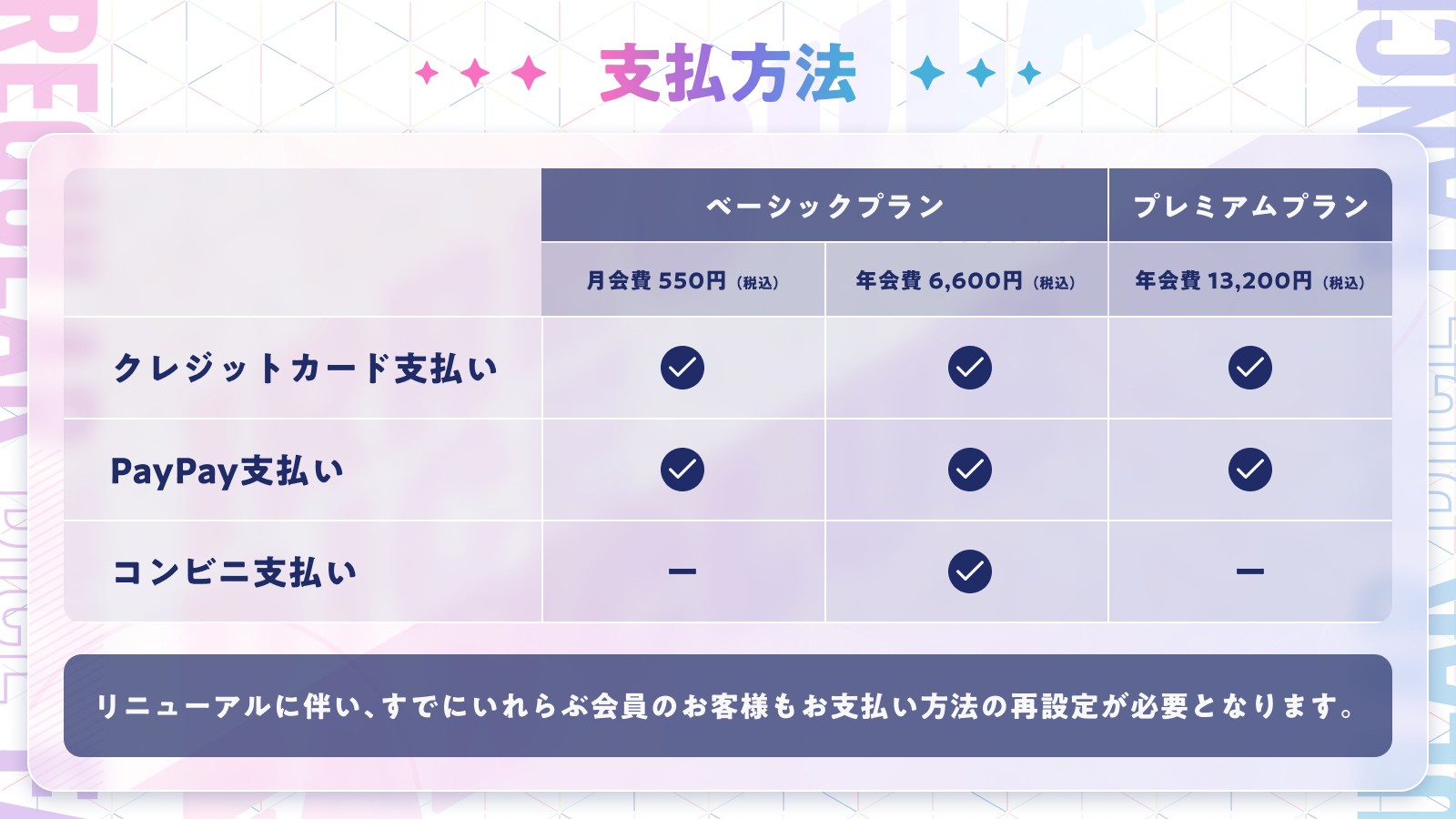 リニューアルに伴い、会員プランごとに使用可能な決済手段が一部変更となります。