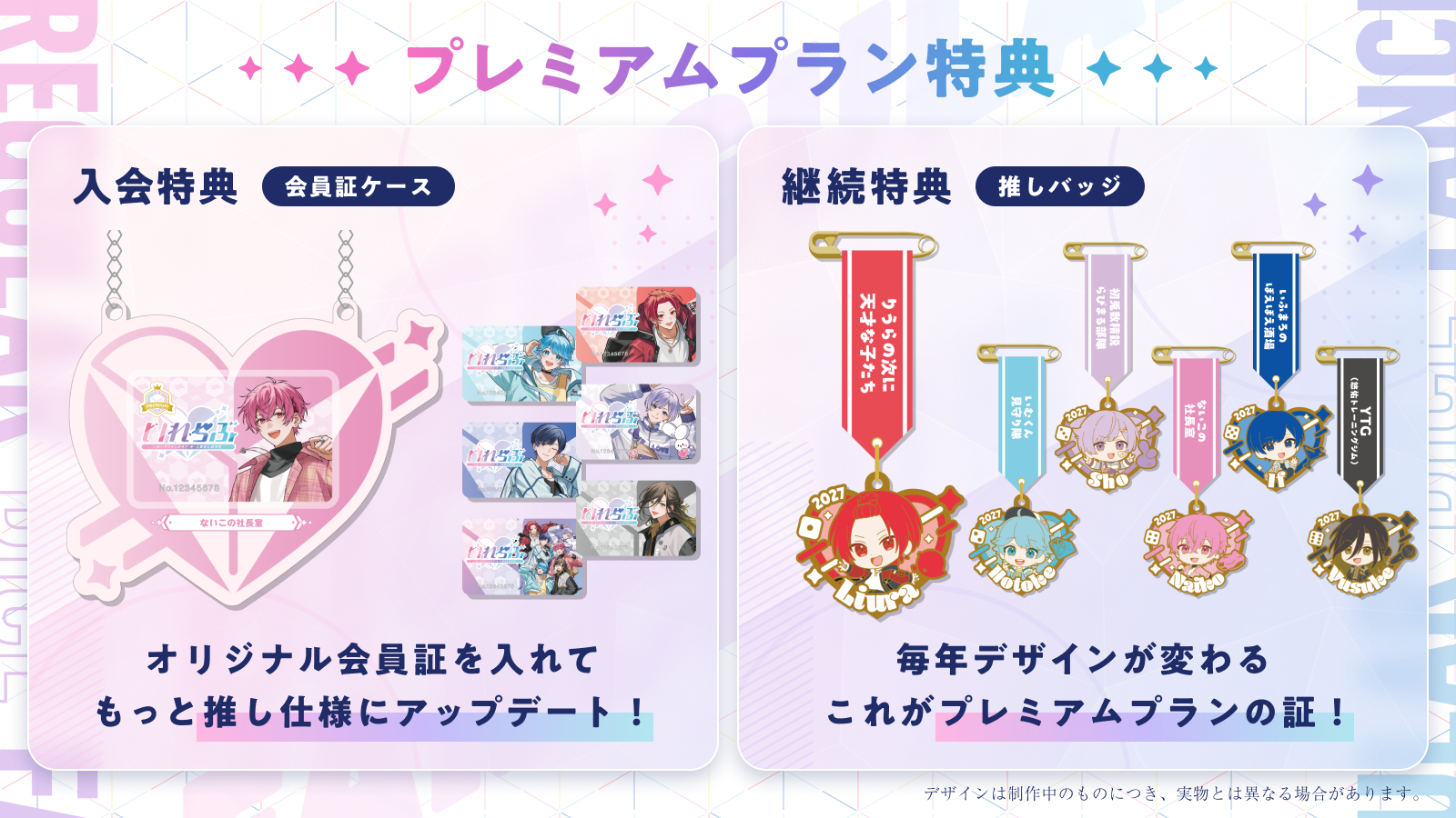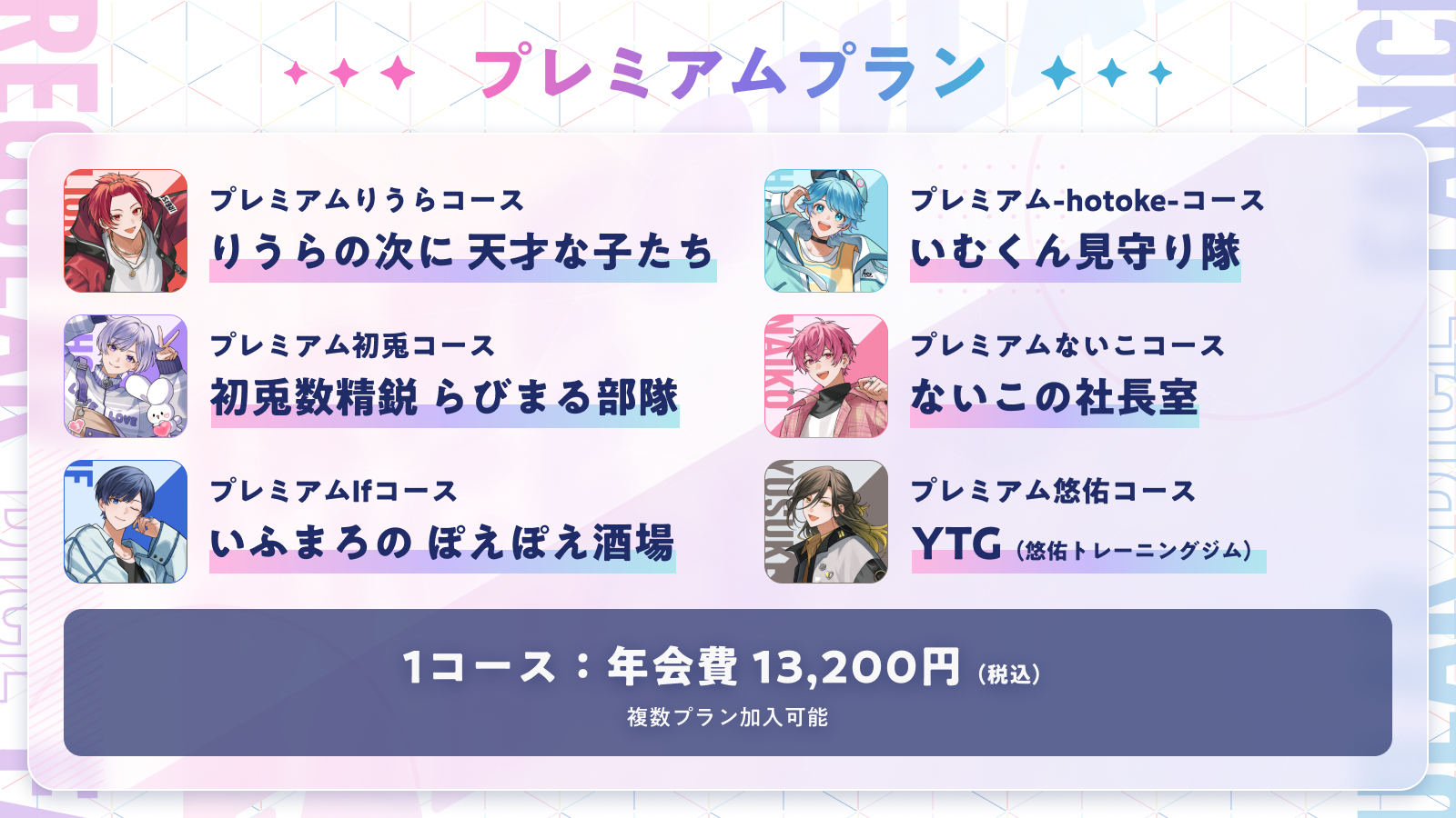 既存の会員プラン(月額会員:550円、年額会員:6,600円)に加え、より深くいれいすメンバーを応援したい方に向けて、各メンバーごとの「プレミアムプラン」を新設します。