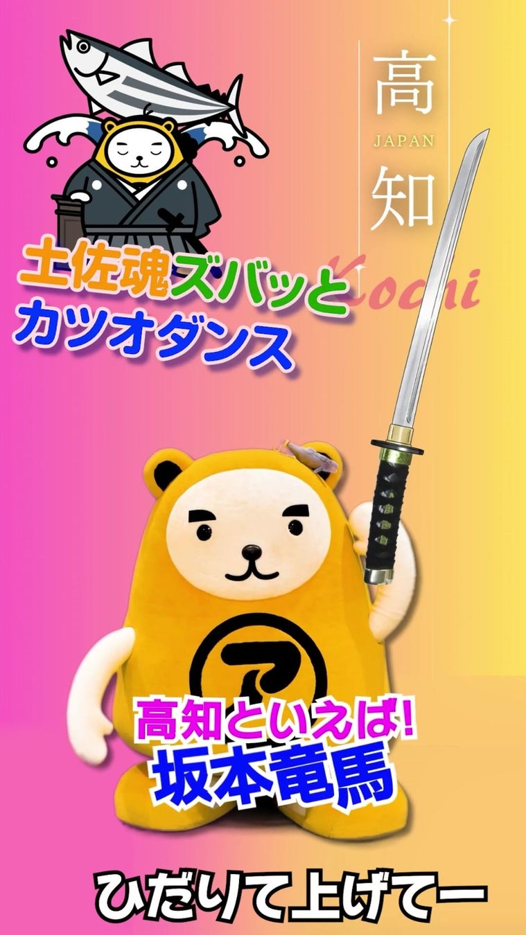 高知県ダンスは、刀を持った勇ましい姿で日本の偉人坂本龍馬をイメージした演出や、郷土料理のカツオを象徴するビジュアルなど、高知ならではの魅力が次々と登場します。歴史の重みと文化の温かさ、グルメの楽しさを、べあ~君の軽やかなダンスとともに表現します。見る人が笑顔になるような躍動感あふれる世界観で、高知の魅力を楽しく届けます。