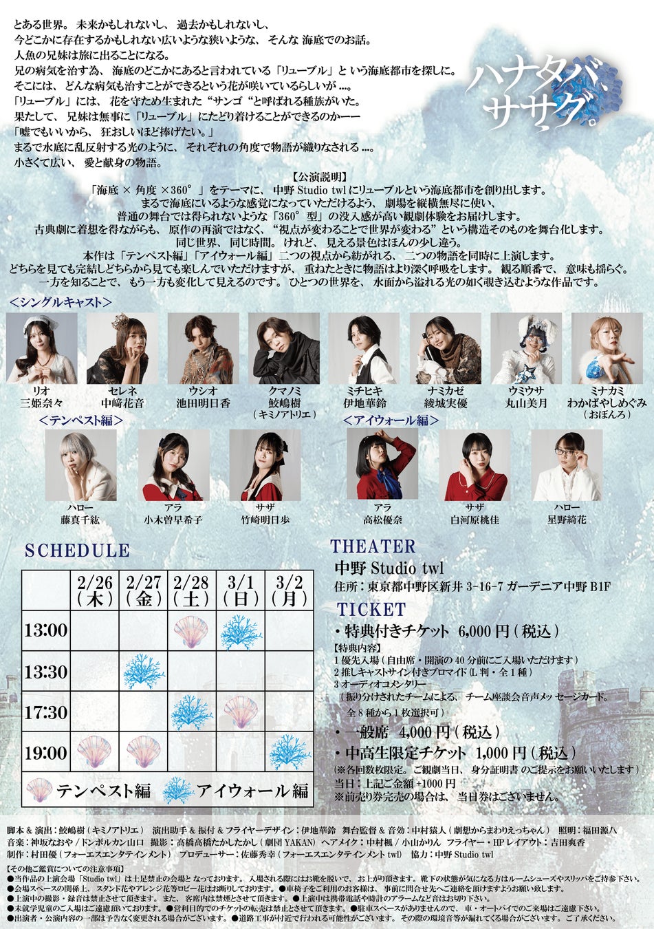 『ハナタバ、ササグ。』が2026年2月26日 (木) 〜 2026年3月2日 (月)に中野Studio twl(東京都 中野区 新井 3-16-7 B1F)にて上演されます。
