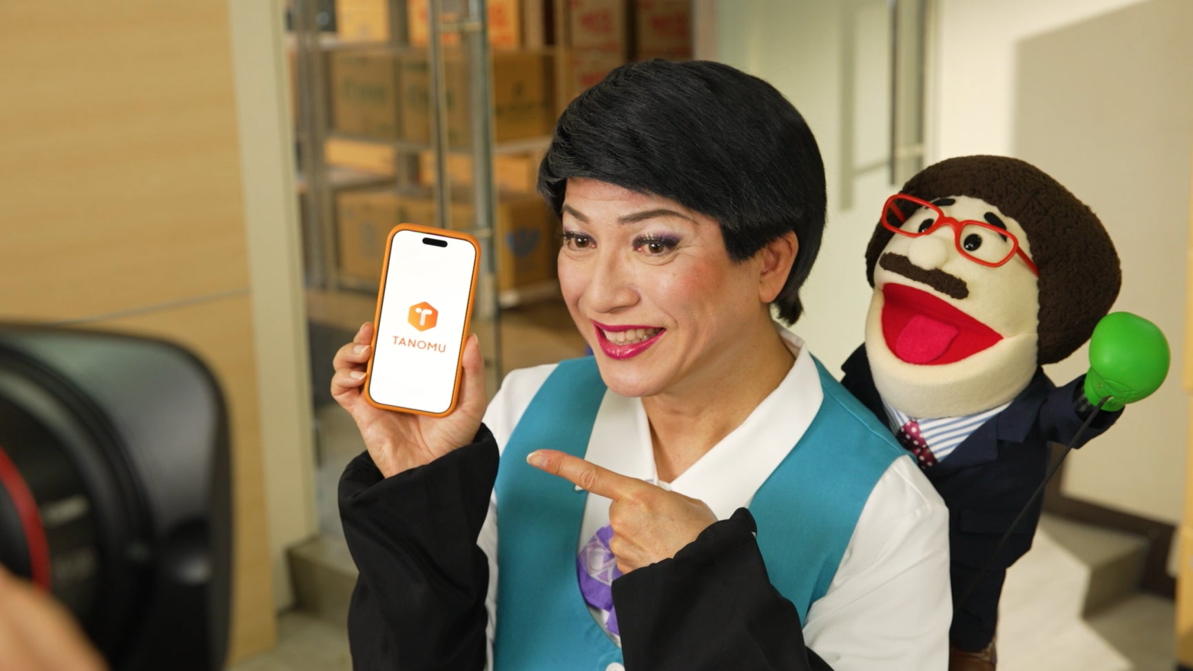 「TANOMU」を導入した食品卸会社を訪れるリポーターの魅川 憲一郎さん。突然現れるパペット人形『AIぐしけんくん』と一緒に、食品卸担当者にインタビューをします。