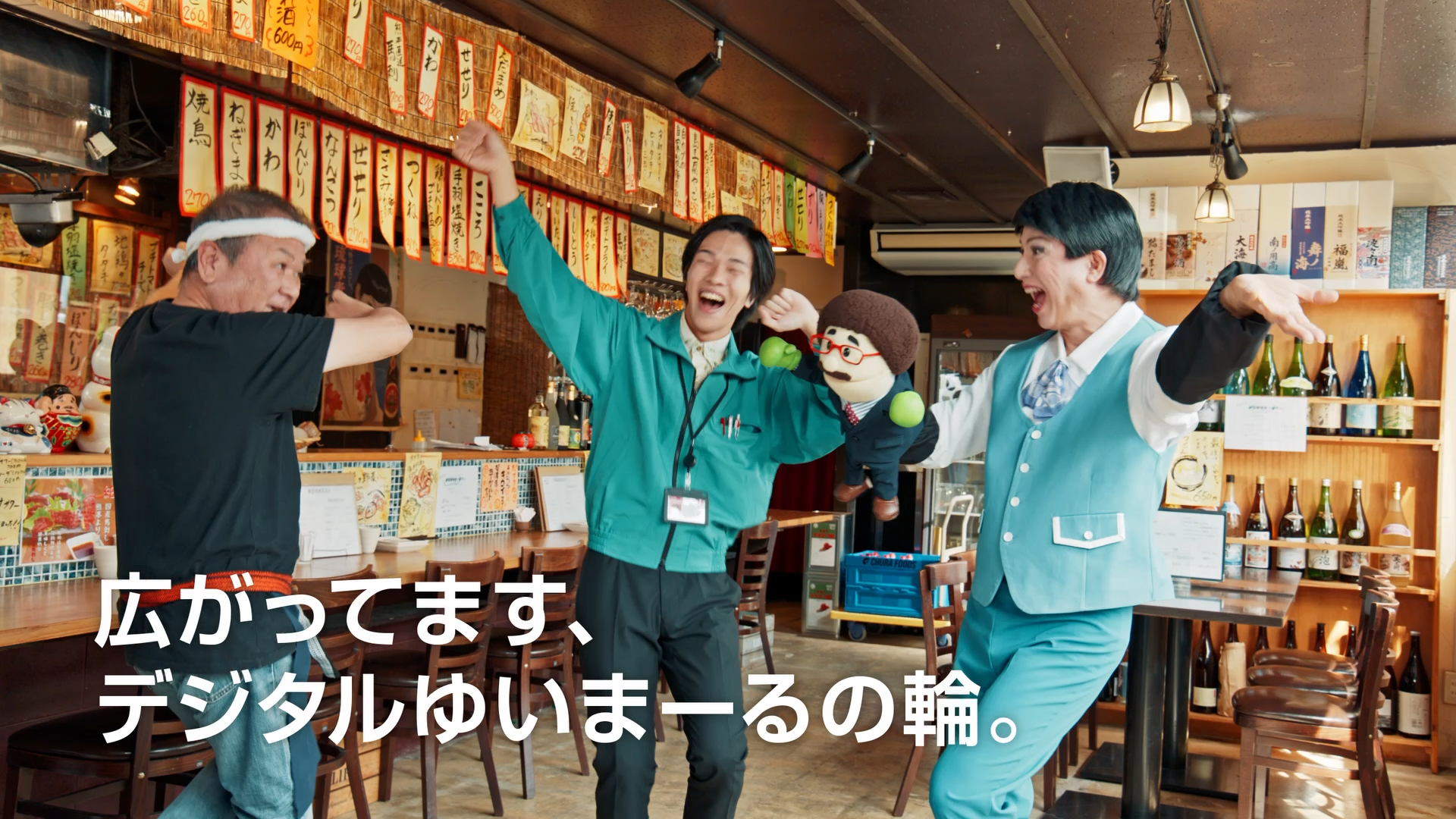 導入前は電話やFAXで飲食店から受注していたため、ミスやトラブルが多く発生していましたが、導入後は受注をデジタル化したことでミスも減り、食品卸と飲食店双方の負担が軽減されたと喜びの声をあげます。「TANOMU」を通じてお互いに支え合う食品卸担当者と居酒屋店主が、仲良く『デジタルゆいまーる』ポーズを披露。最後は沖縄伝統の「カチャーシー」を踊り、お互いにハッピーになれた喜びを表現します。