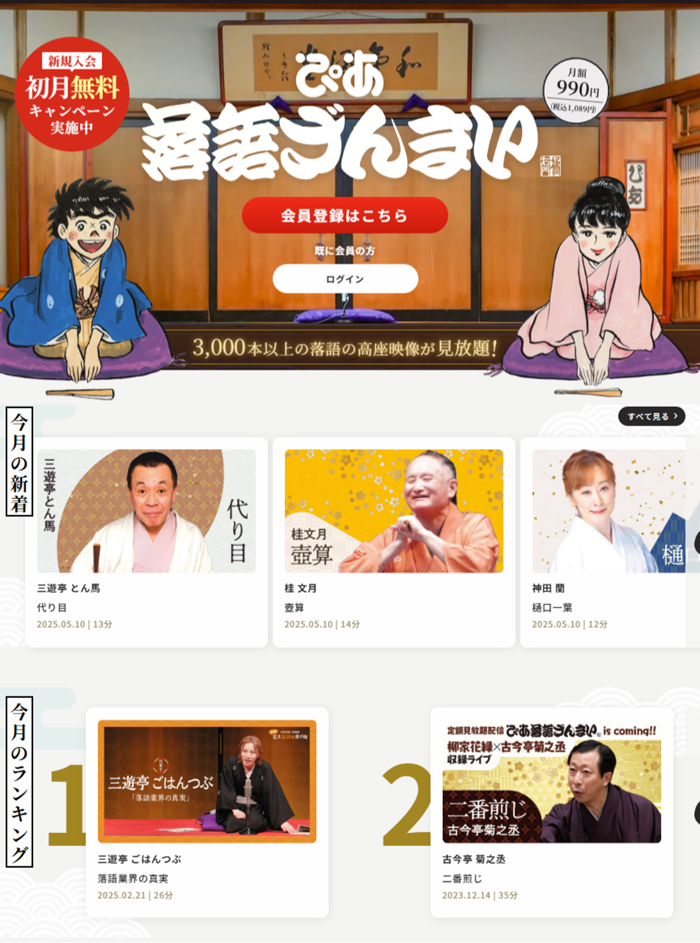また、ただいま新規入会の初月無料キャンペーンを実施中。新規入会日(有料会員登録)から1ヶ月間は無料で高座映像の見放題サービスをお楽しみいただくことが出来ます。