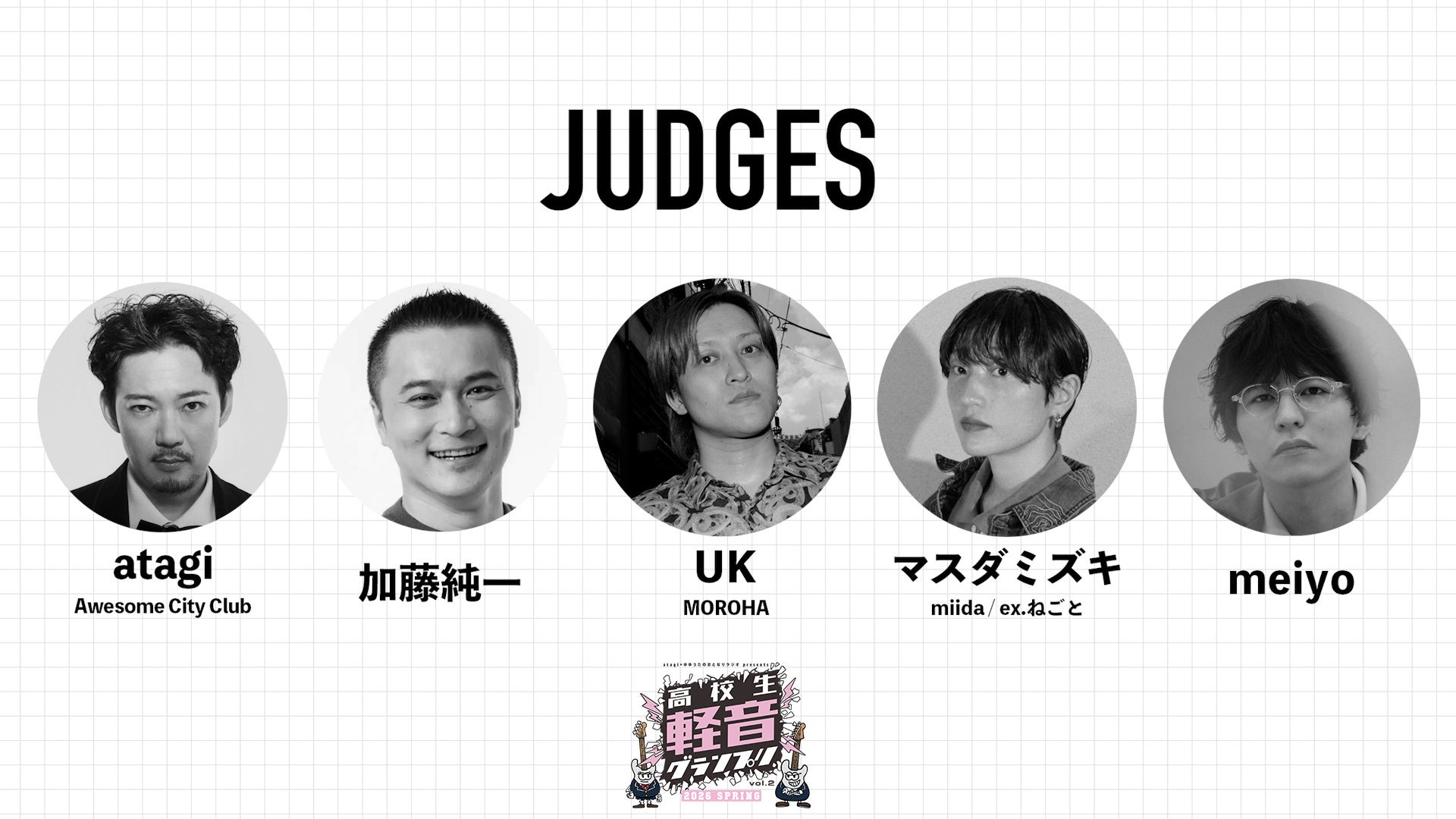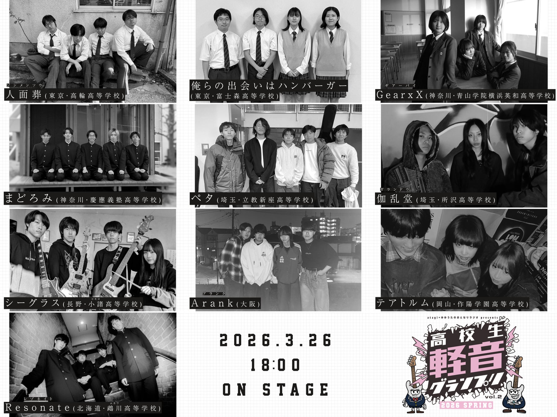 「高校生軽音グランプリ」とは、YouTubeの音楽番組「atagi✕ゆゆうたのおとなりラジオ」が主催となる高校生バンドの全国大会。2026年3月26日に横浜みなとみらいで開催される決勝戦では、動画審査で選ばれた高校生バンドがオリジナル曲を生放送で生演奏。プロのミュージシャンらが審査し、高校生No1バンドを決定する。