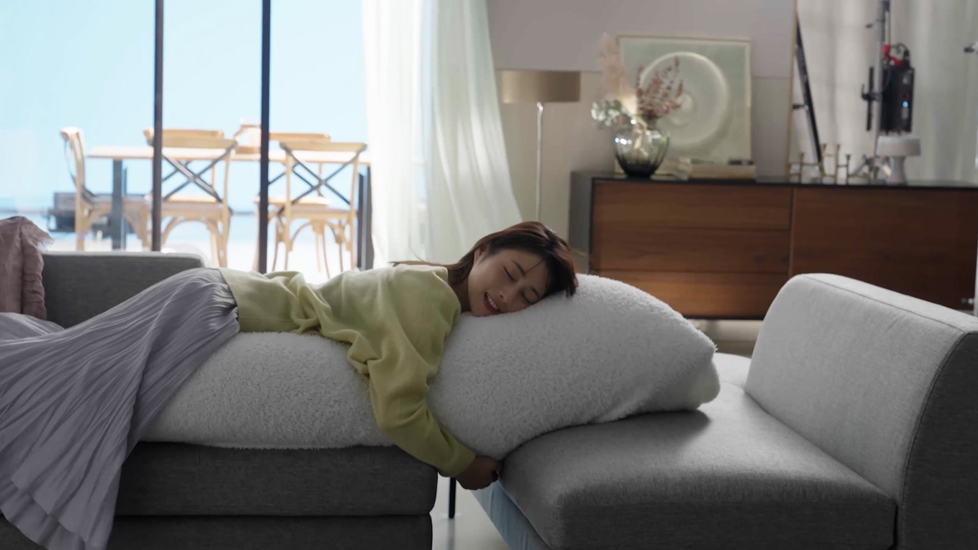 現実の世界でソファに積み上げたタオルブランケットに顔をうずめながら「は~…」と心地よい吐息を漏らす石原さんが目を閉じると、そこはふわふわな雲の上。石原さんはパステルカラーの世界の中で心地よさに包まれながら寝返りを打ち、再び現実の世界へ戻ってきますが、そこもやはり「ハミングフレア リラックス ムスクアロマの香り」で仕上げられたタオルブランケットの上なので、そのままリラックス気分を味わい続けます。
