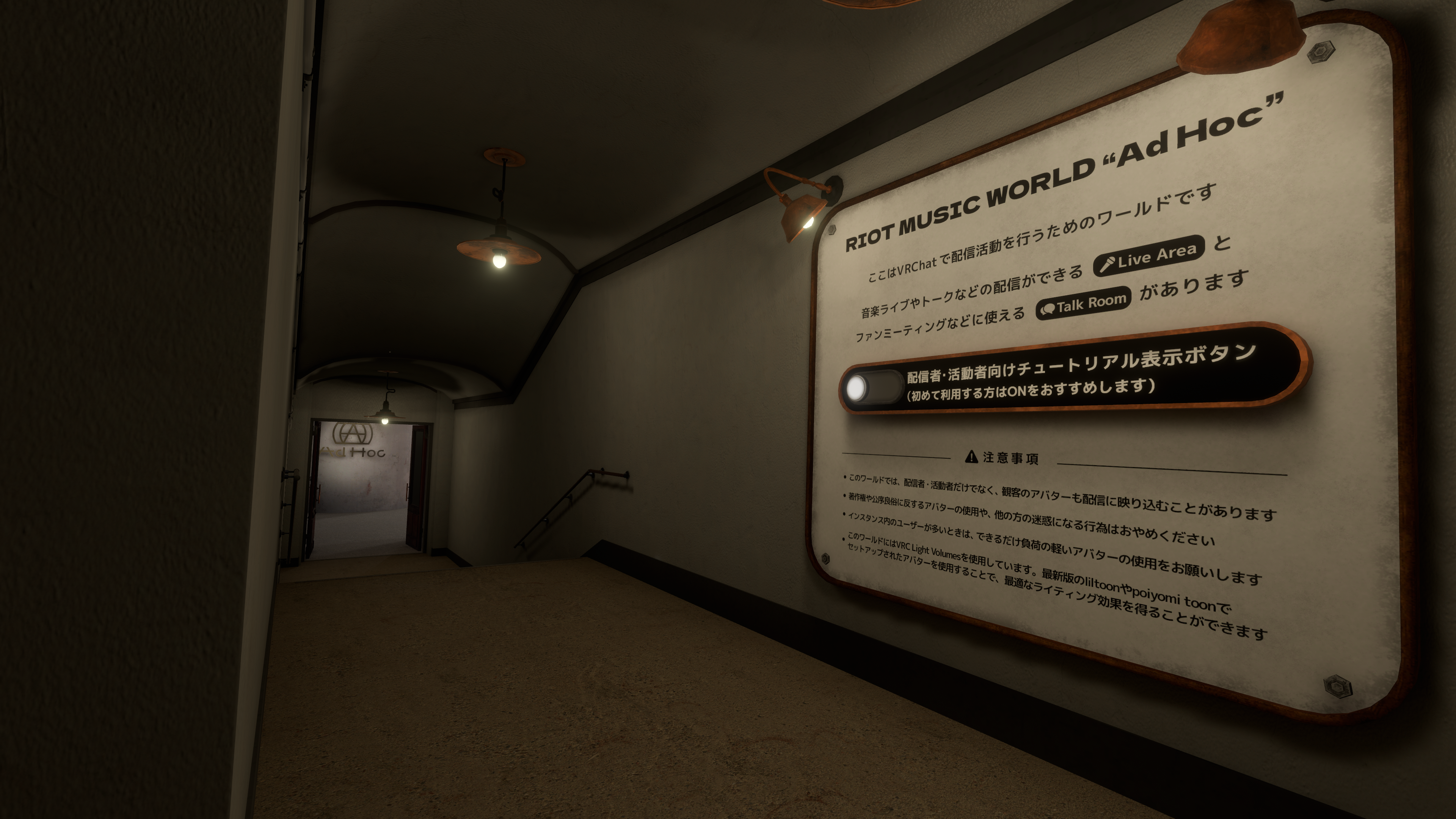 RIOT MUSICによるVRChatワールド「誰でもお気軽配信ワールド AdHoc -アドホック-」(以下、AdHoc)がパブリック公開となりました。同ワールドの企画・制作をクリエイティブスタジオMIGIRIが担当しています。