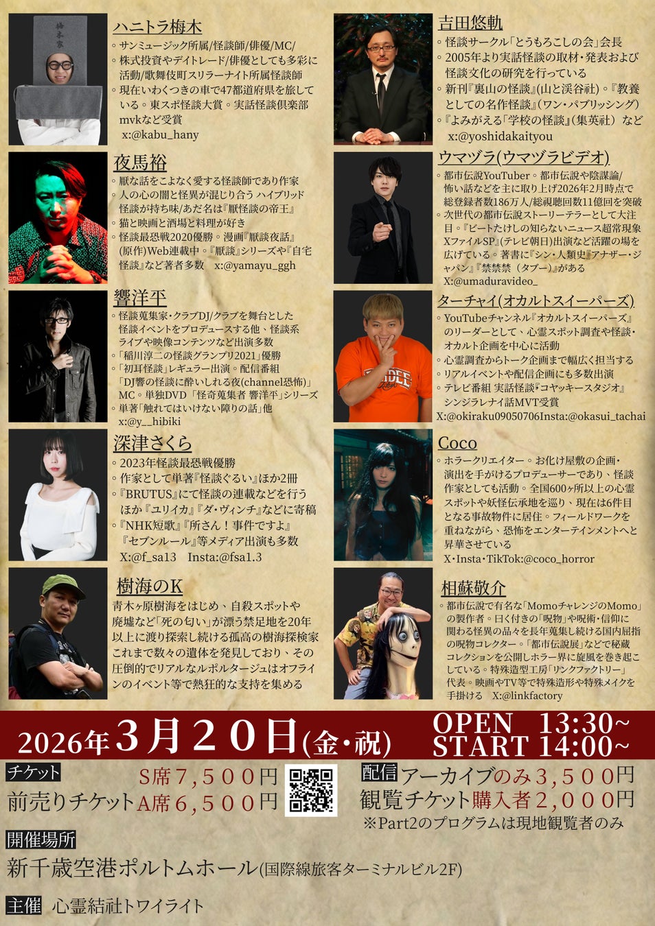 本イベントは、出演者の各SNSの総フォロワー数を合わせると約300万人にのぼる。絶大な影響力を持つトップクリエイターや、数々の賞を総なめにする実話怪談の頂点、さらには日本の裏側を知る探検家や呪物コレクターまで、普段は絶対に交わることのない「各ジャンルのトップランナー」たちが一堂に会する、まさに前代未聞の「エンターテインメントの祭典」です。