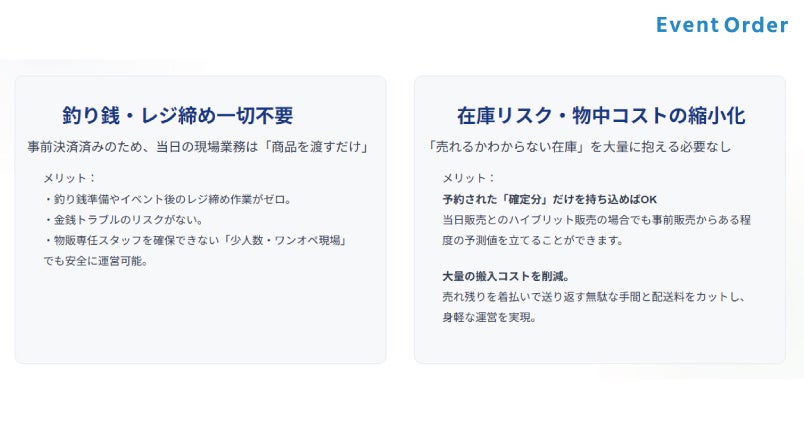 事前決済済みのため、当日の業務は「商品を渡すだけ」。金銭トラブルが起きず、物販専任スタッフがいない少人数の現場でも安全に回せます。