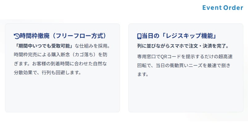 事前決済済みのため、当日の業務は「商品を渡すだけ」。金銭トラブルが起きず、物販専任スタッフがいない少人数の現場でも安全に回せます。