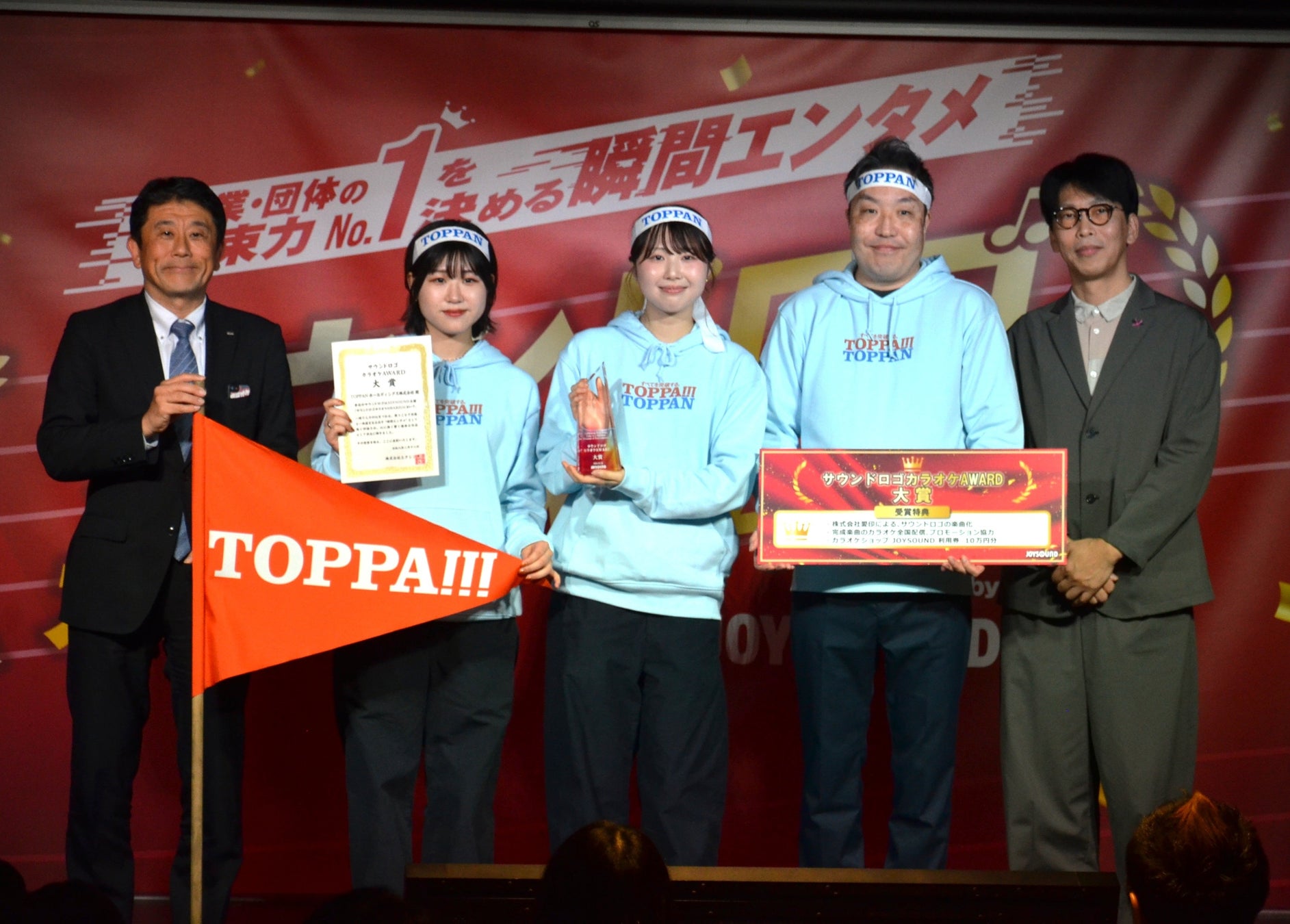 表彰式では、代表者が「初代サウンドロゴカラオケAWARDを突破(TOPPA!!!)できるとは思っていなかったので、驚いています!」と喜びのコメント。祝福ムードに包まれる中、表彰状とトロフィーが授与されました。副賞として、TOPPANホールディングスには、CM音楽やテレビ・ラジオ・ 映画など、幅広いメディア向けの音楽制作を手がける株式会社愛印による、サウンドロゴの楽曲化(サウンドロゴを含む楽曲を制作)、およびそのカラオケ配信権が贈られました。