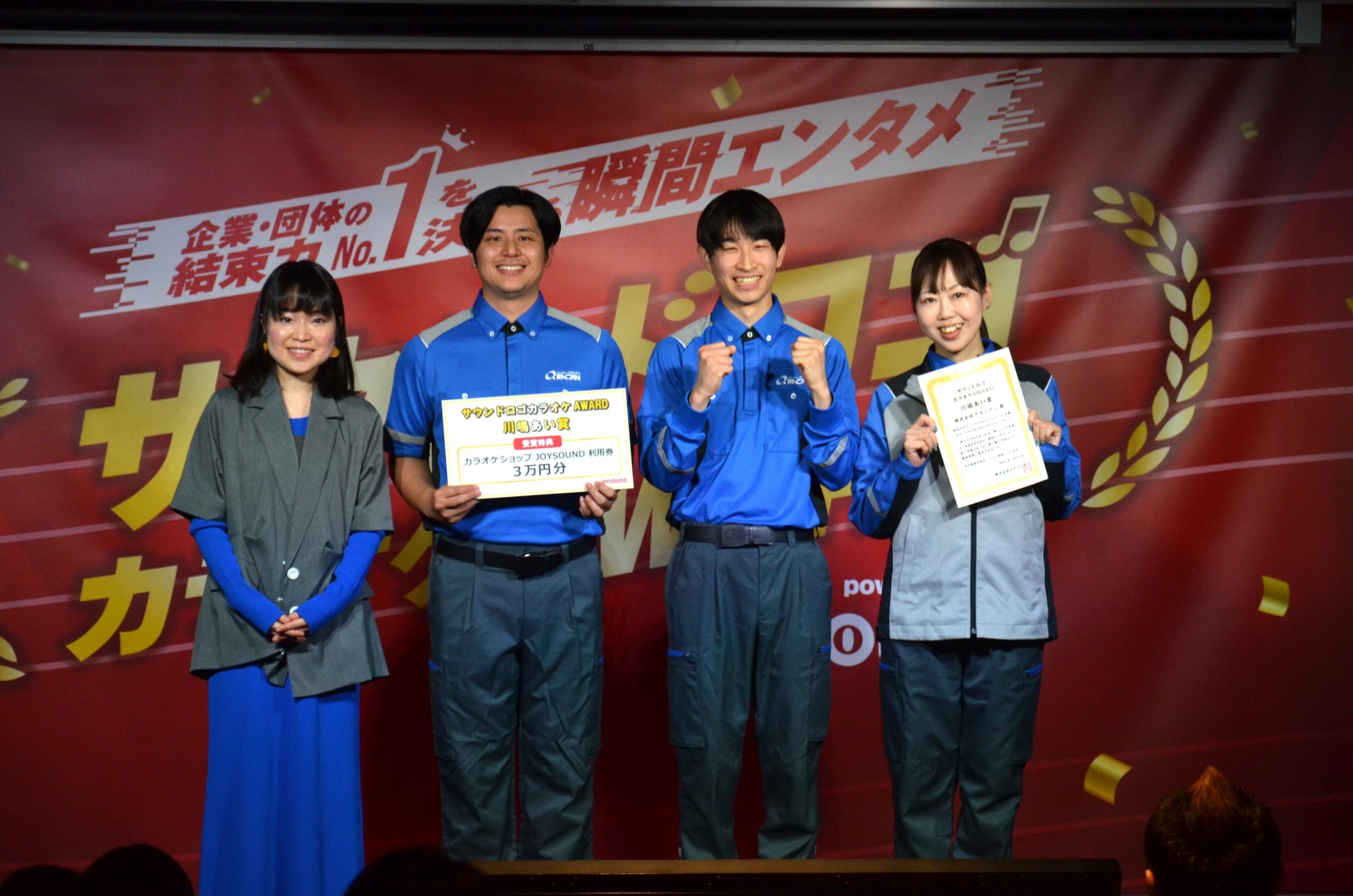 企業や商品、サービスを短いメロディやフレーズで印象付けるサウンドロゴに、カラオケという体験要素を掛け合わせた新しい試みが「サウンドロゴカラオケ」は、わずか数秒の歌唱の中にブランドの魅力を自然に織り込み、歌うという能動的な行動を通して、その場にいる仲間との一体感を生み出します。今回の決勝ステージもまた、そんな「サウンドロゴカラオケ」を通じて、競い合うライバル同士でありながら、会場はまさにひとつになるような盛り上がりに包まれました。参加した企業・団体は、自身のサウンドロゴに込めた想いを、個性あふれるパフォーマンスで全力表現。漫才のような掛け合い、キャラクターとの共演、ダンスを取り入れた演出など、多彩なステージが続き、サウンドロゴが披露されるたびに会場から大きな拍手が送られました。さらに、配信を通じて見守る視聴者からも熱のこもった反応が寄せられ、ライブイベントならではの熱気に満ちた決勝となりました。