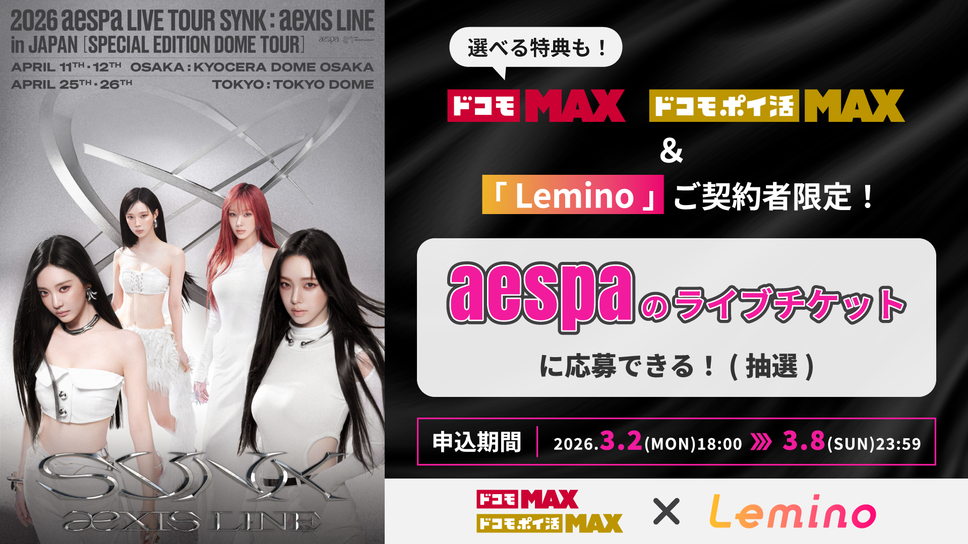 株式会社NTTドコモ(以下、ドコモ)は、本日2026年3月2日(月)より、「ドコモ MAX」「ドコモ ポイ活 MAX」をご契約かつLeminoをご契約のお客さま※1※2※3を対象に、「aespa」のライブチケット限定販売を開始しました。
