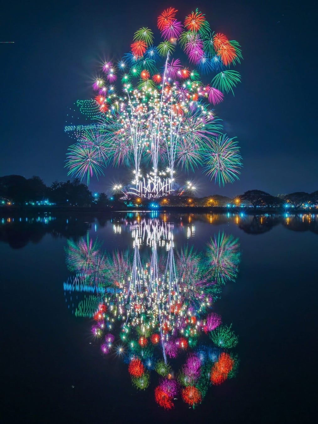 2日目の2月4日は、ナーン県の守護寺院「ワット・プラタート・チェーヘン」付近でドローンショーを実施。ナーン川で行われる伝統的な水上競技「長尾舟レース」や仏塔のシルエット、ラーンナー文化圏に受け継がれるランタンの灯りなどをモチーフに、ナーンおよびタイの歴史と文化を表現しました。
