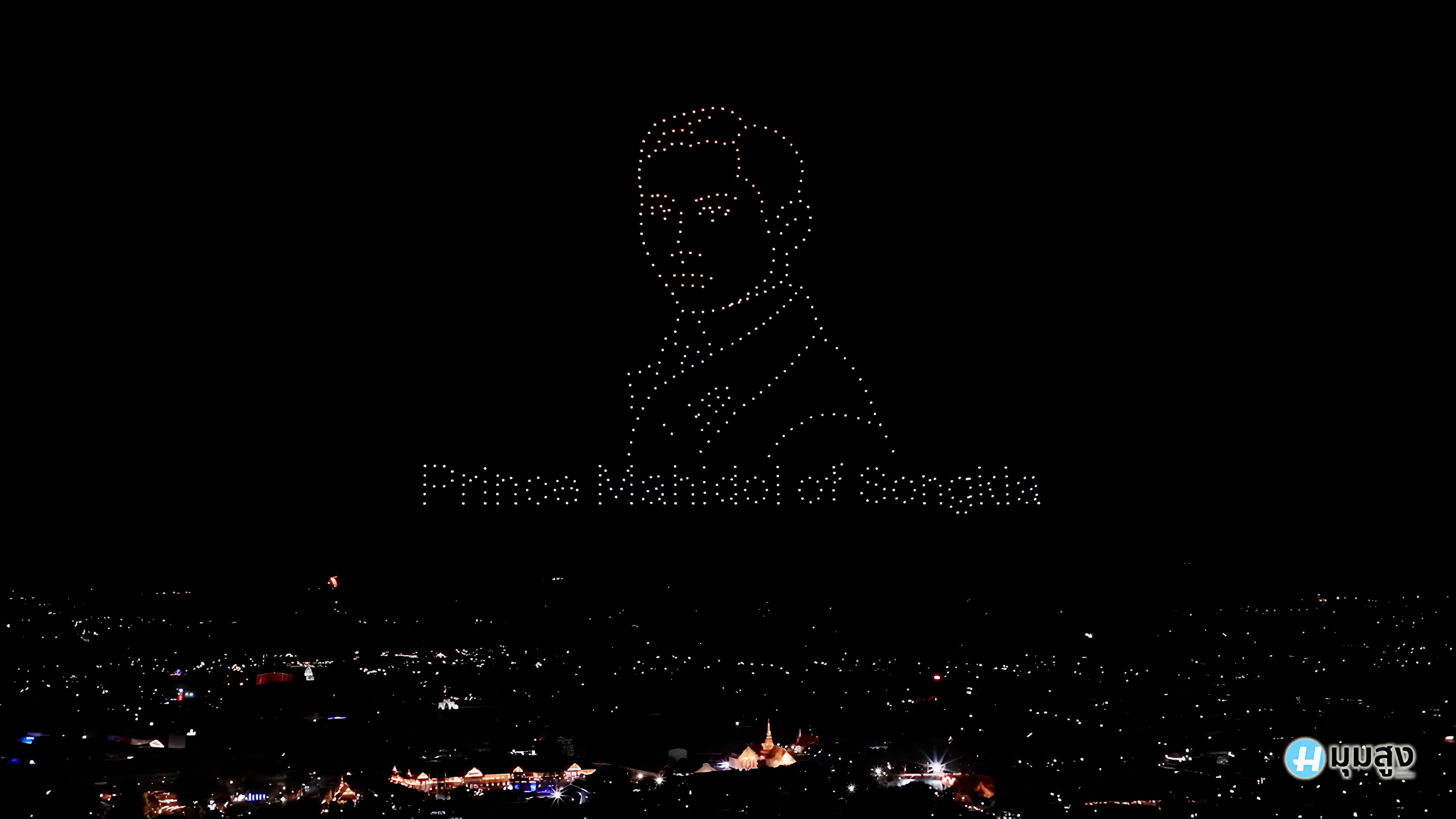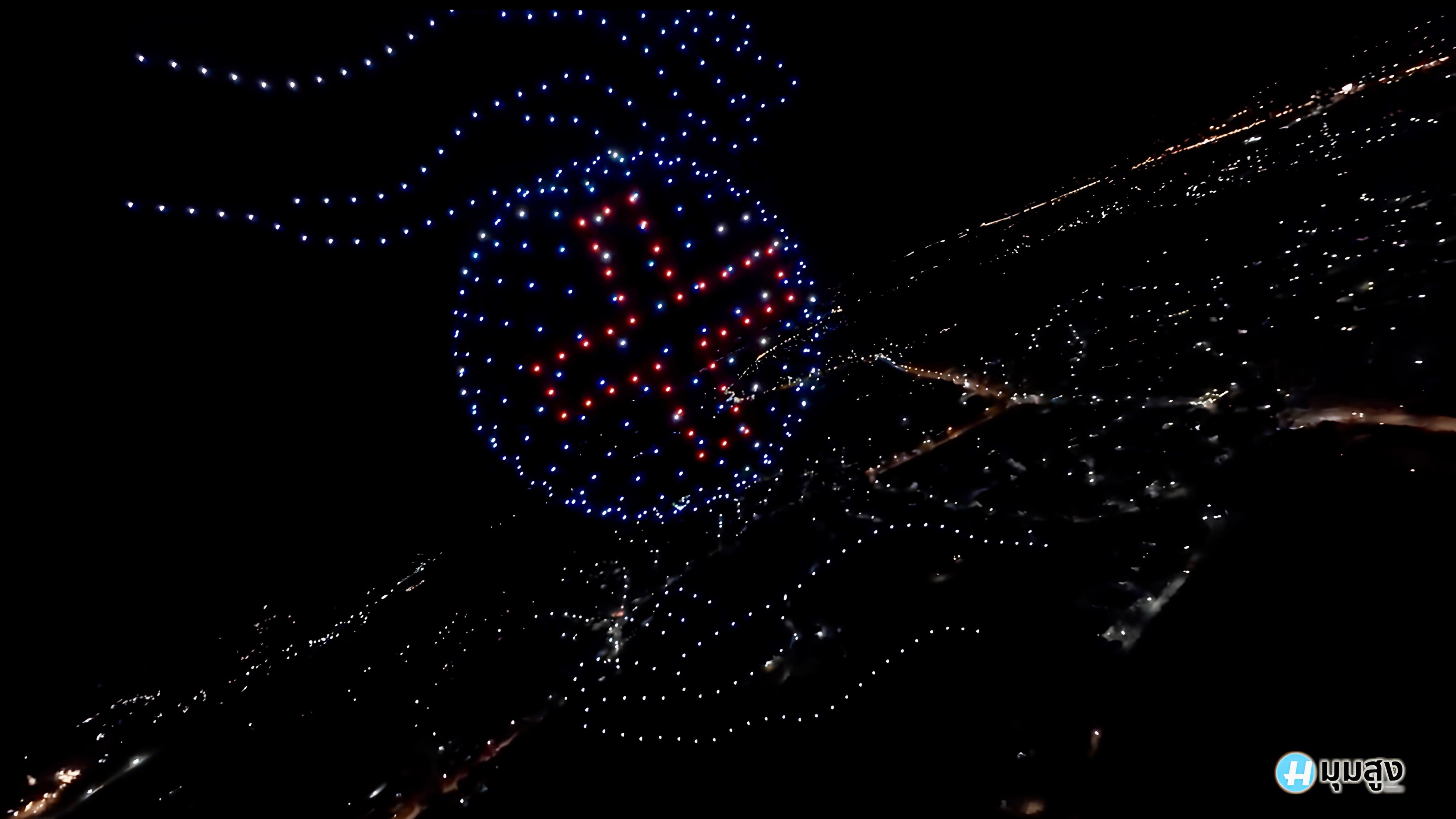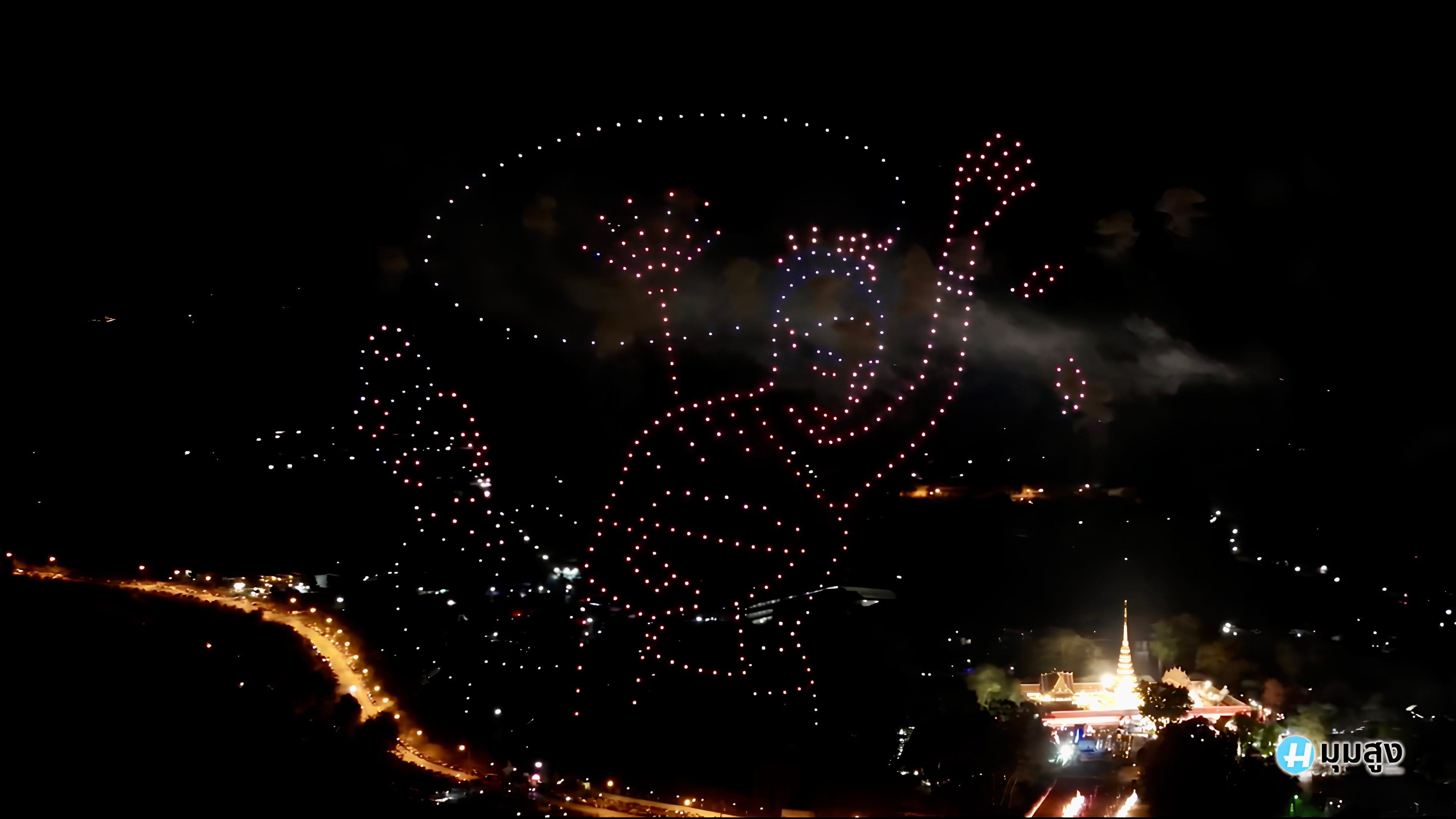 2日目の2月4日は、ナーン県の守護寺院「ワット・プラタート・チェーヘン」付近でドローンショーを実施。ナーン川で行われる伝統的な水上競技「長尾舟レース」や仏塔のシルエット、ラーンナー文化圏に受け継がれるランタンの灯りなどをモチーフに、ナーンおよびタイの歴史と文化を表現しました。