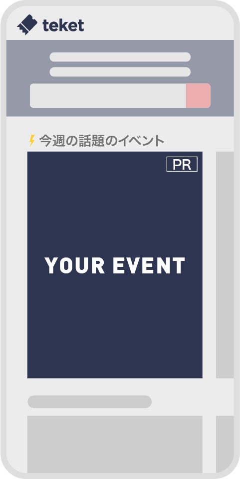 多くのユーザーが訪れるteketのトップページの最初のコンテンツ「今週話題のイベント」にPR枠として掲載されます。1枠につき2イベントが訪問ユーザーによってランダムに表示されます。5日間の掲載です。