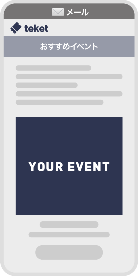多くのteketユーザーに対してイベントを認知いただける最も効果的なメニューです。過去のチケット購入履歴や居住地エリア等の情報から、よりイベントに興味を持ってくれそうなユーザーにメールを配信いたします。1メール1イベント掲載です。