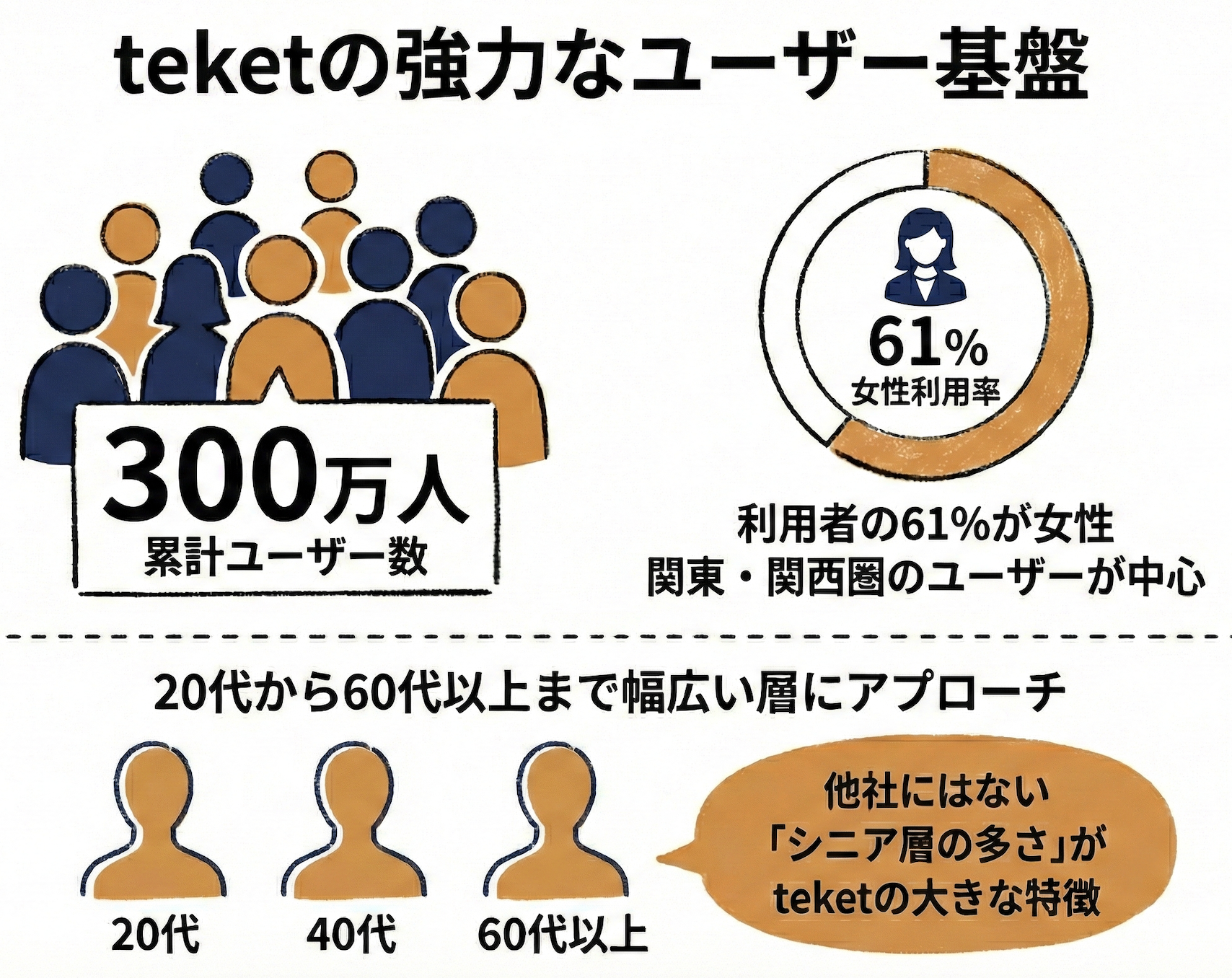 女性ユーザーの比率の高さ: 利用者の男女比は女性が61%、男性が39%と、特に女性層に強く支持されています。
